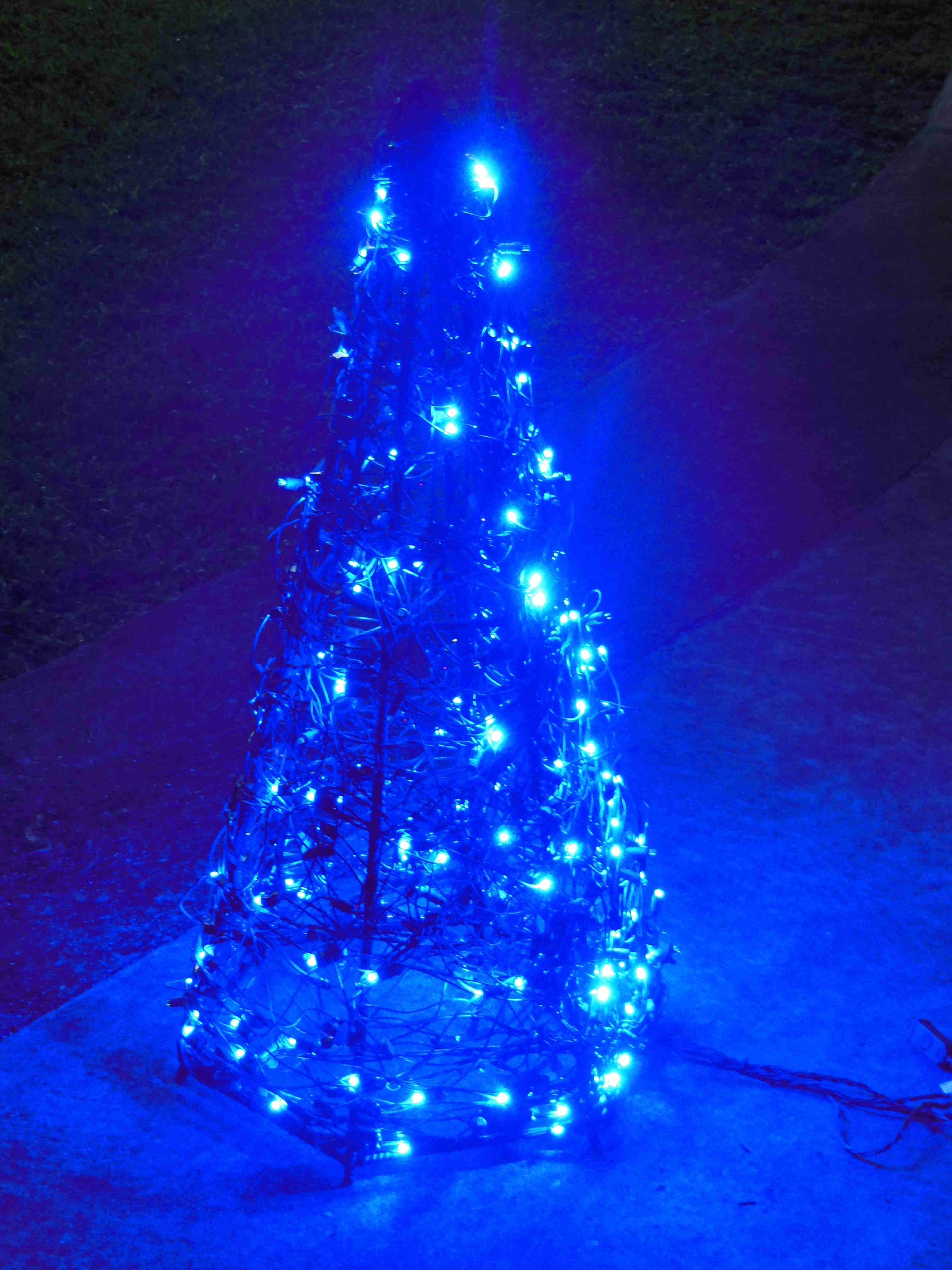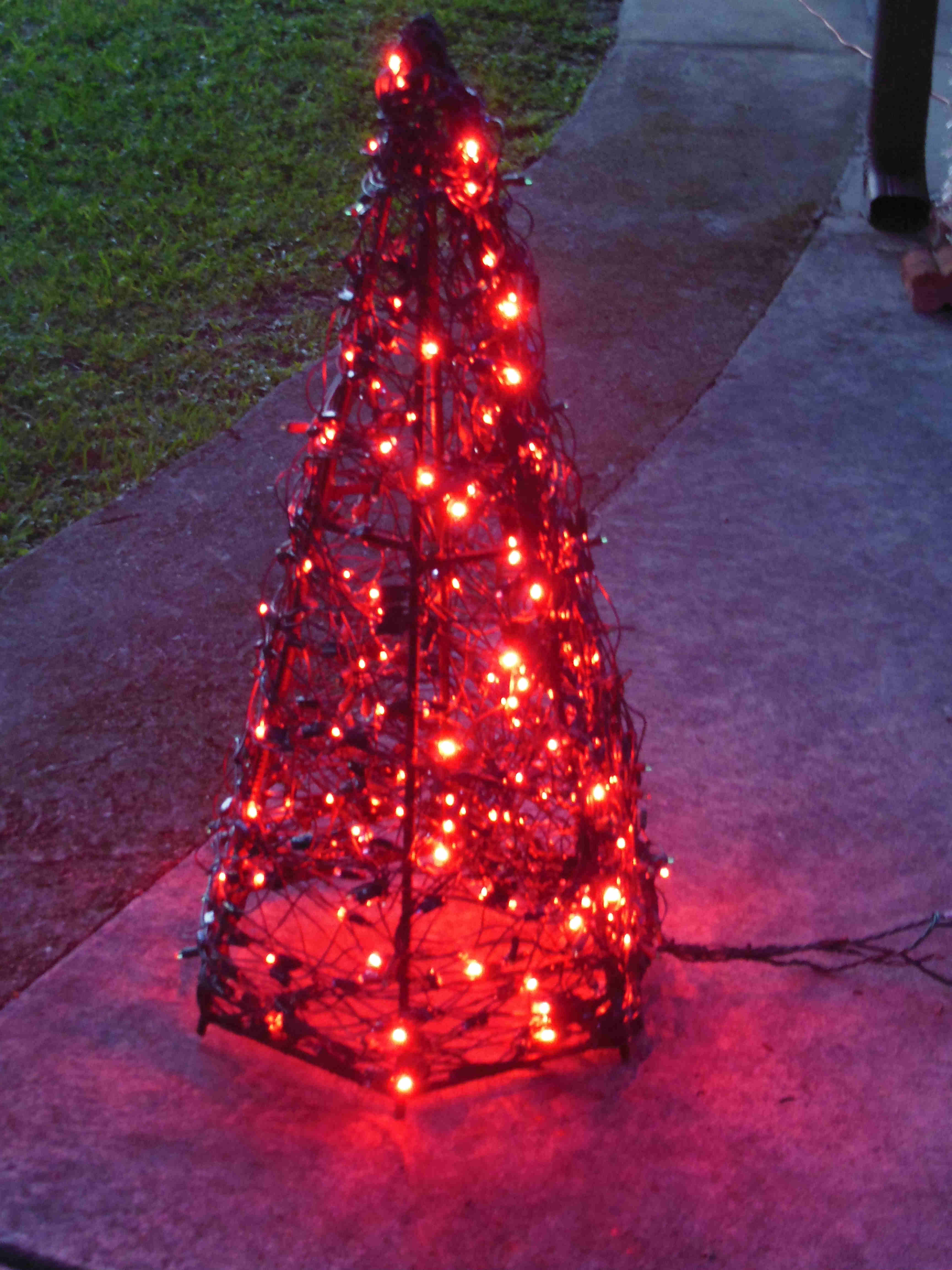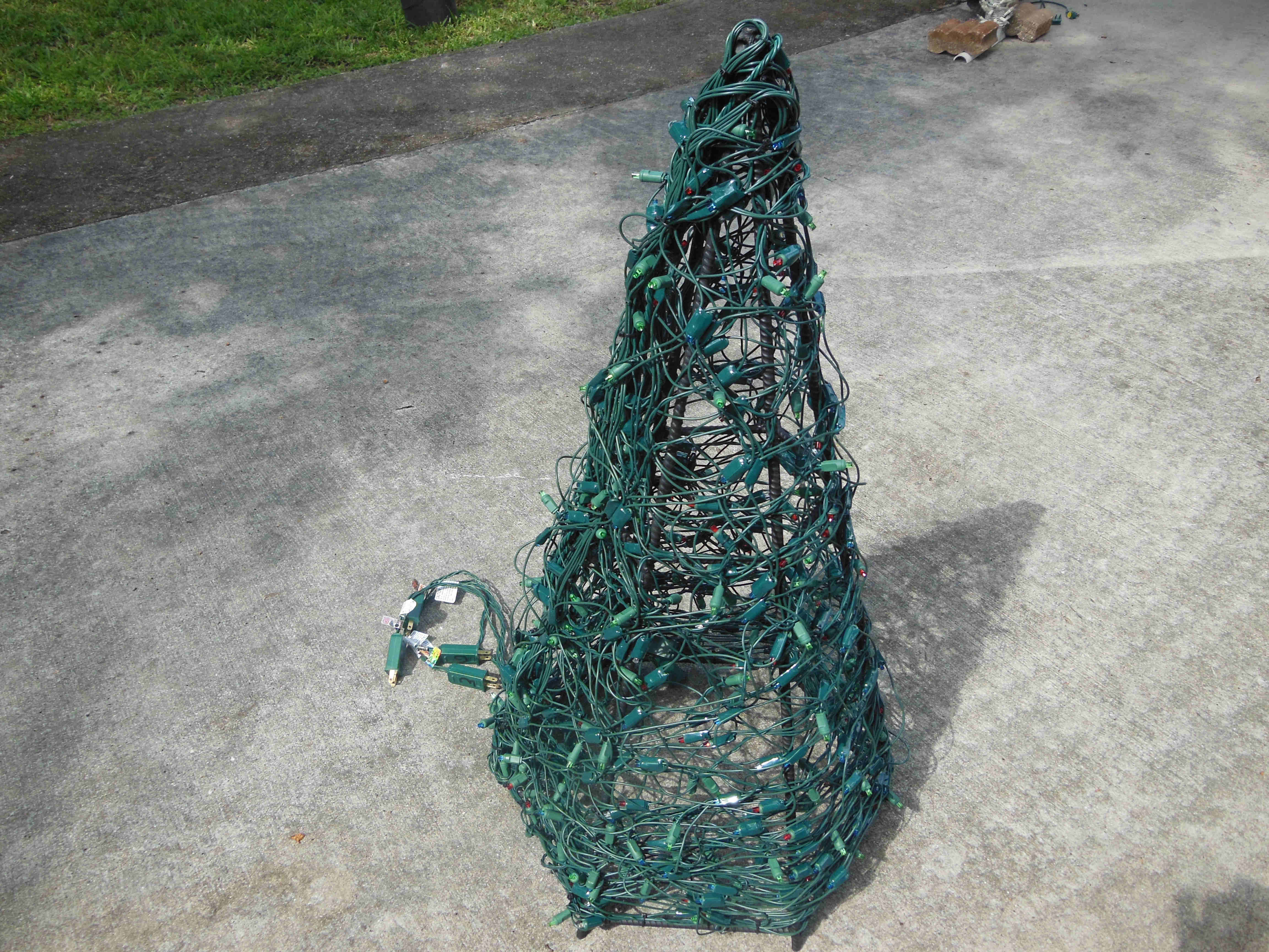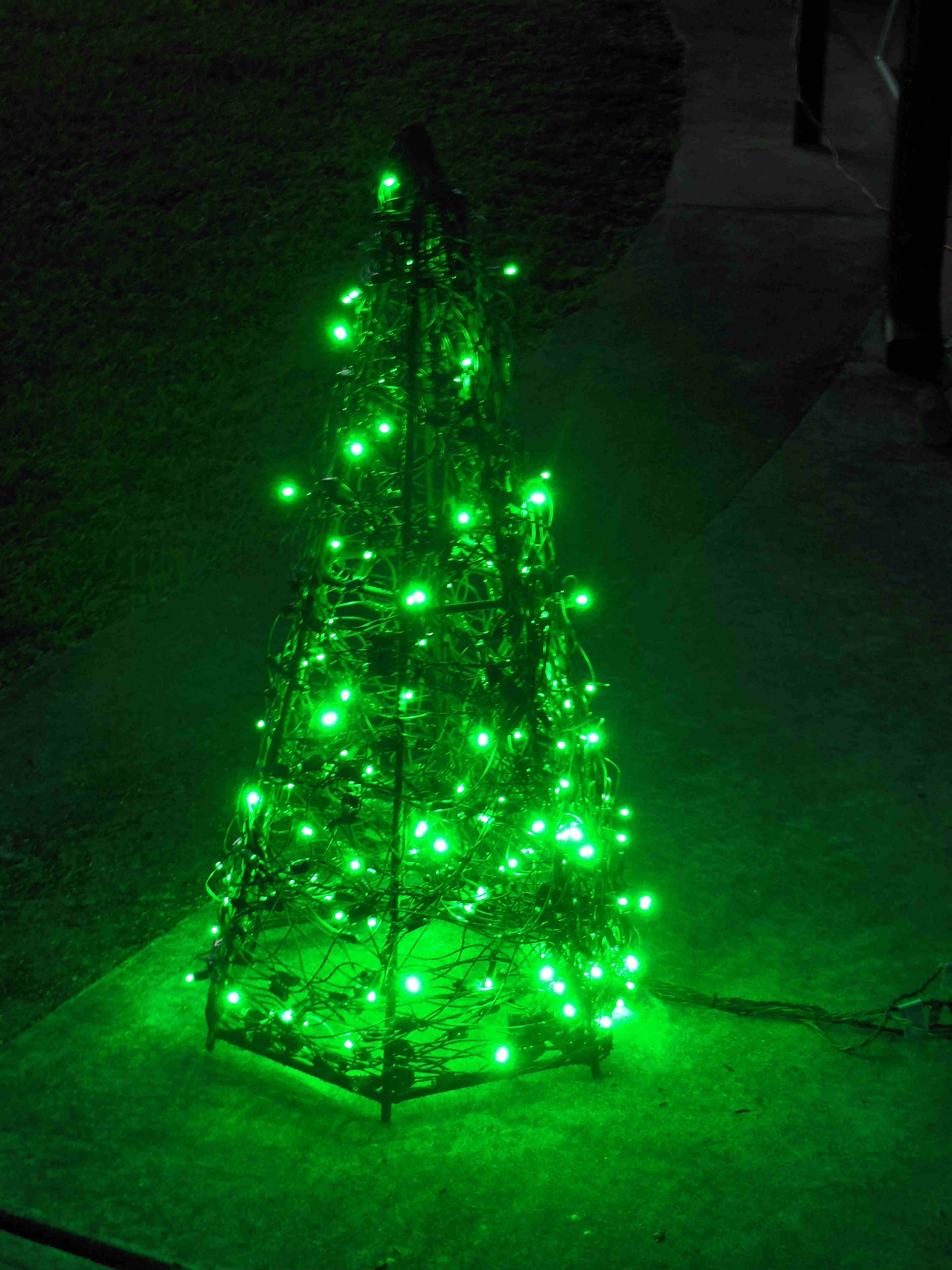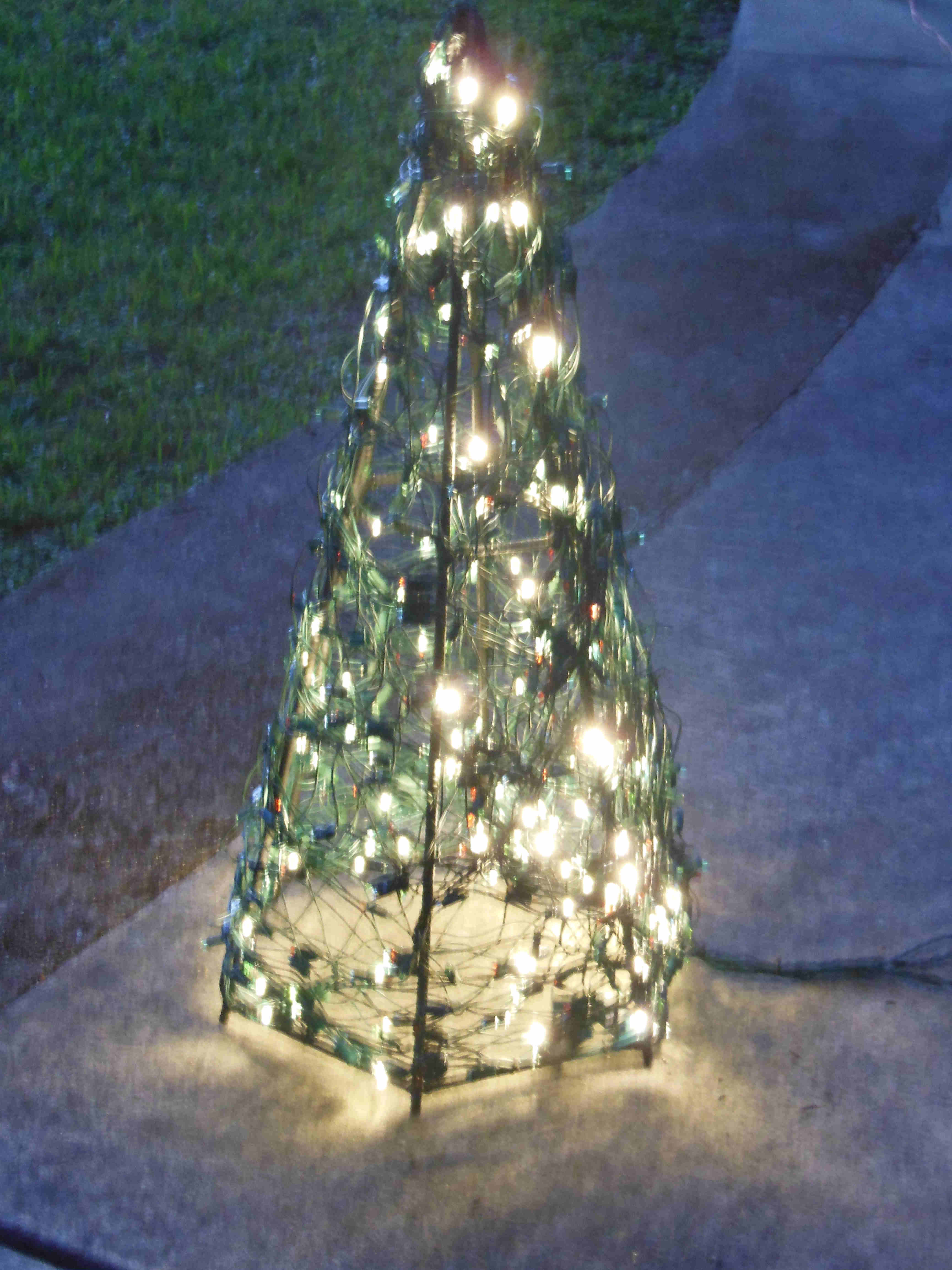 A 24" square board was used as a platform in which an 18" diameter circle was drawn. Doing some math it was found an upright was needed every 9 3/8" approximately. A string was cut that size and was ran around the circumference marking a line at the end of the string. This gave six uprights spaced evenly. A hole was drilled large enough that the rebar would fit at an angle in each hole. For the tree itself 6 - 37 1/8" 3/8" rebar (used for the uprights), 6 - 4" 3/8" rebar (used for the upper brace), 6 - 8" 3/8" rebar (used for the bottom brace), 2 - spray cans flat black paint, 4" zip ties (for the lights) were used. Weld as seen in pictures. The uprights should be first then the upper brace then lower brace last. Clean and paint. Using 4" zip ties attach lights to tree.