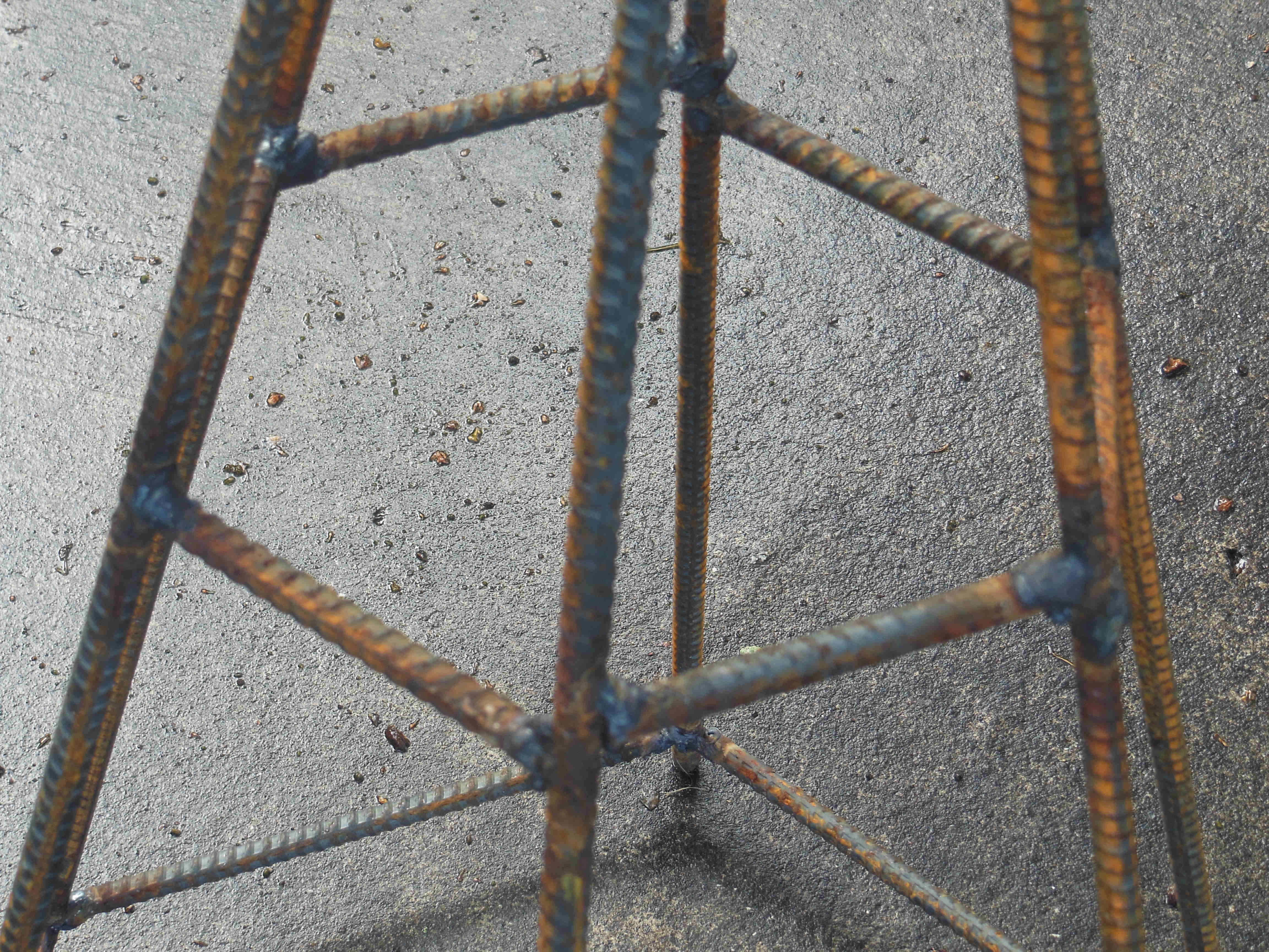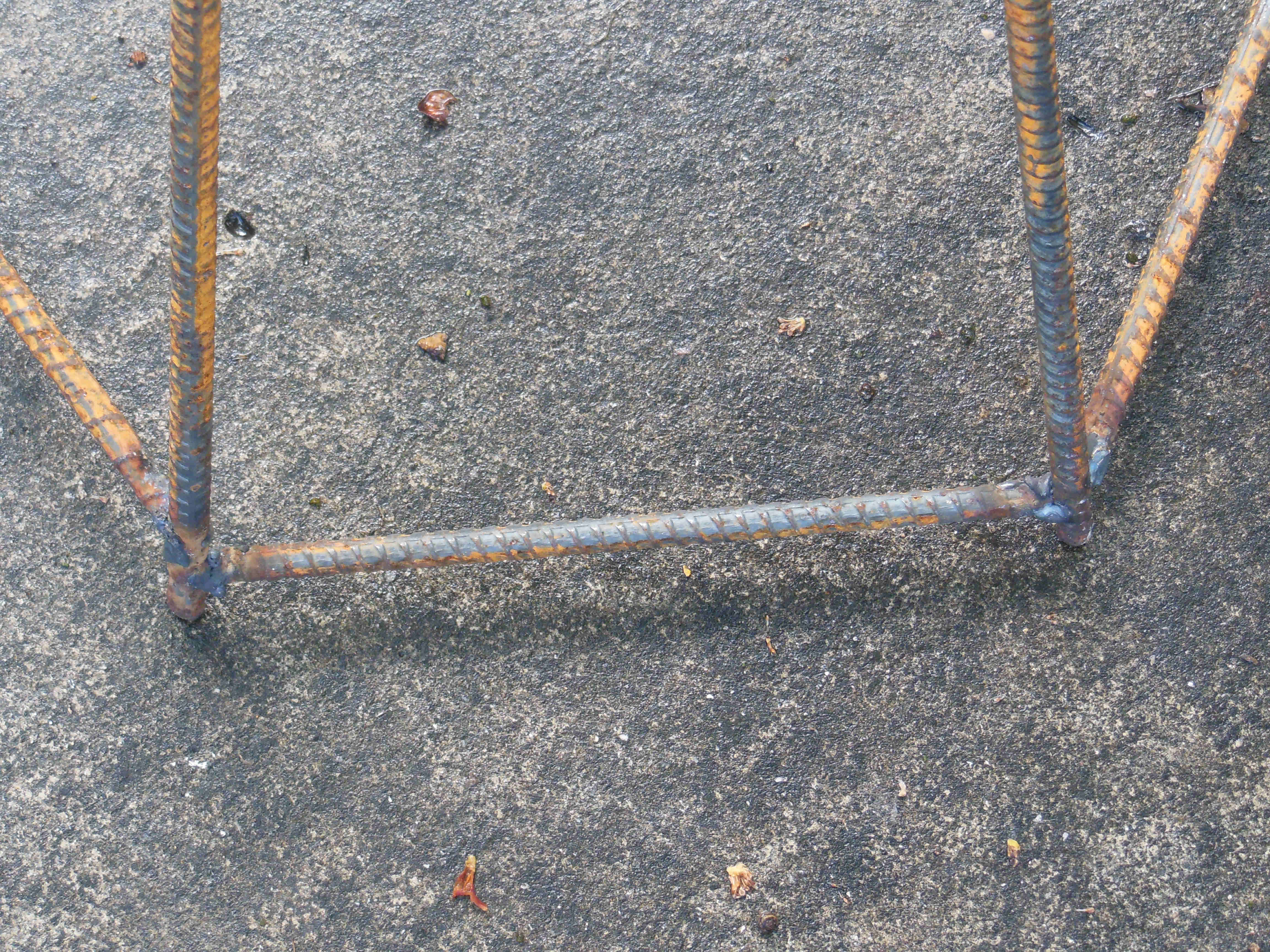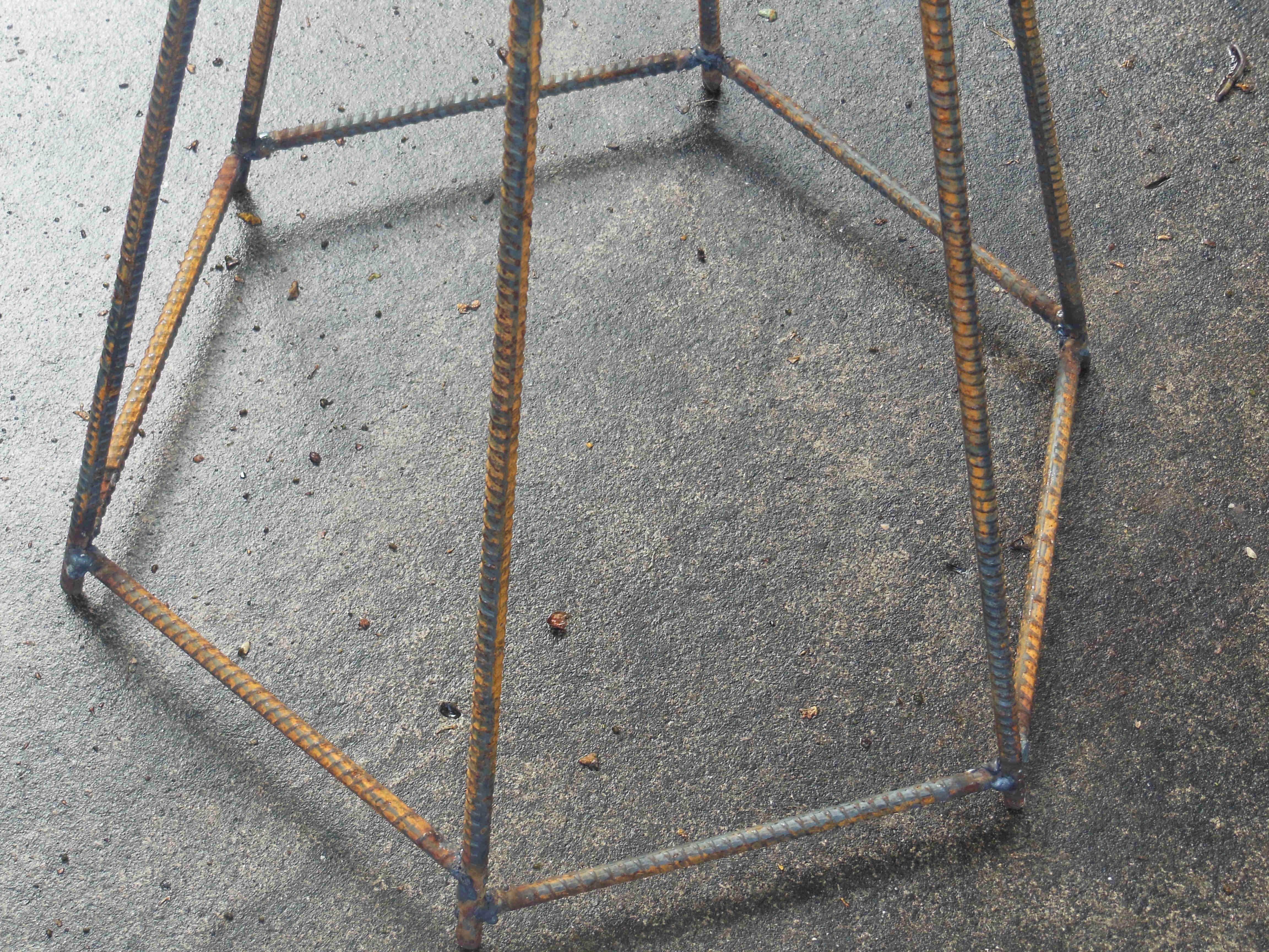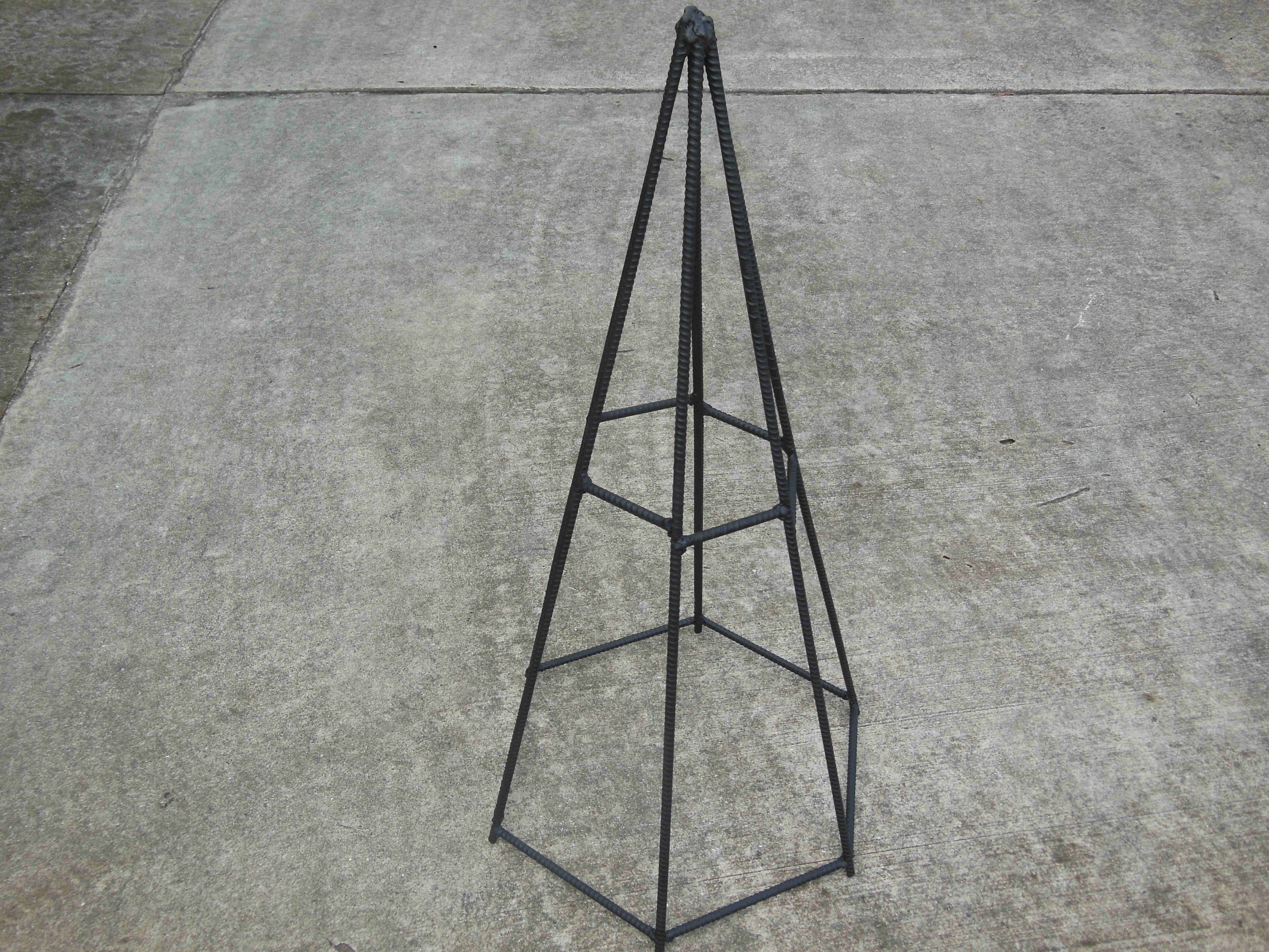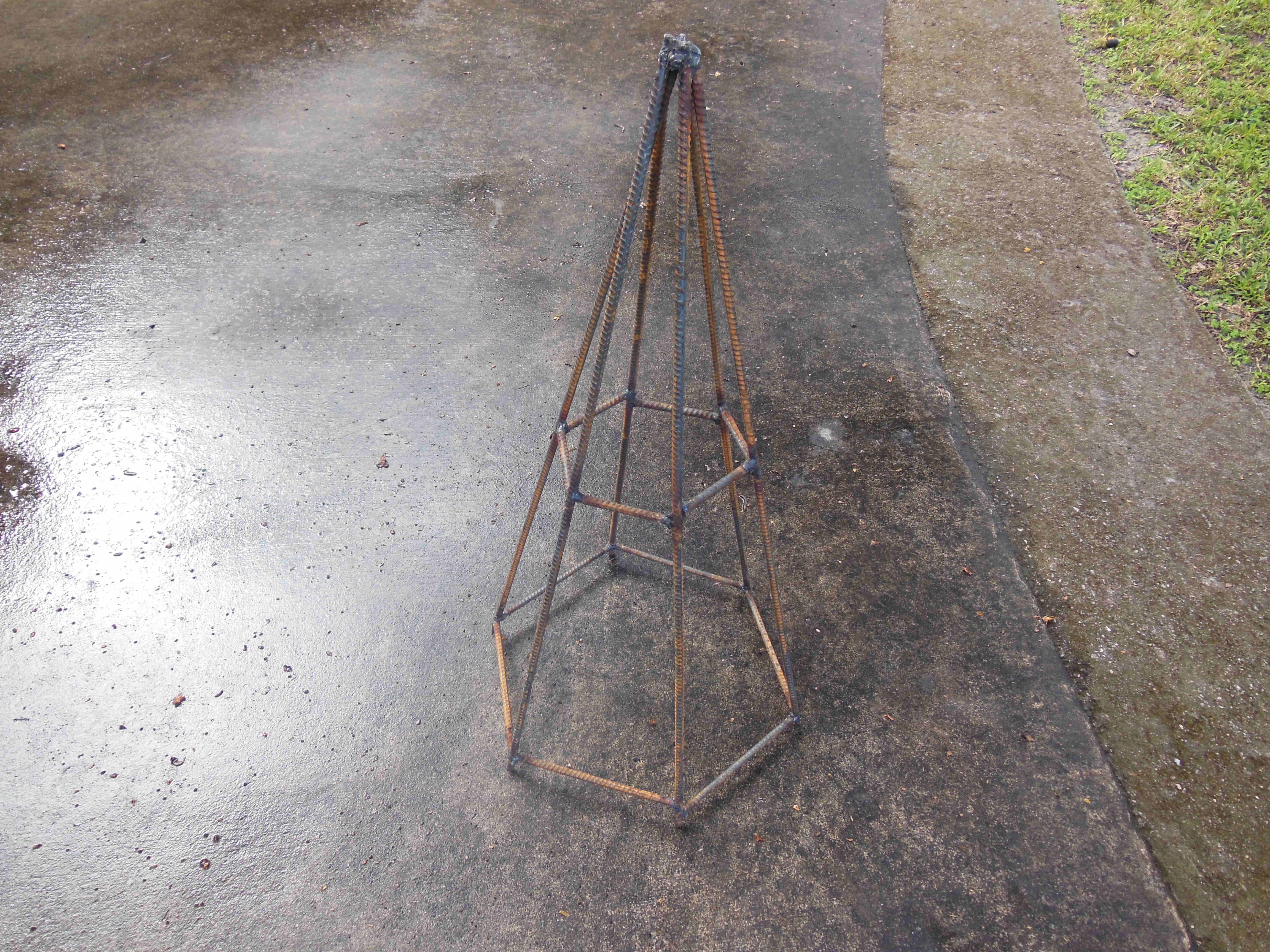 A 24" square board was used as a platform in which an 18" diameter circle was drawn. Doing some math it was found an upright was needed every 9 3/8" approximately. A string was cut that size and was ran around the circumference marking a line at the end of the string. This gave six uprights spaced evenly. A hole was drilled large enough that the rebar would fit at an angle in each hole. For the tree itself 6 - 37 1/8" 3/8" rebar (used for the uprights), 6 - 4" 3/8" rebar (used for the upper brace), 6 - 8" 3/8" rebar (used for the bottom brace), 2 - spray cans flat black paint, 4" zip ties (for the lights) were used. Weld as seen in pictures. The uprights should be first then the upper brace then lower brace last. Clean and paint. Using 4" zip ties attach lights to tree.