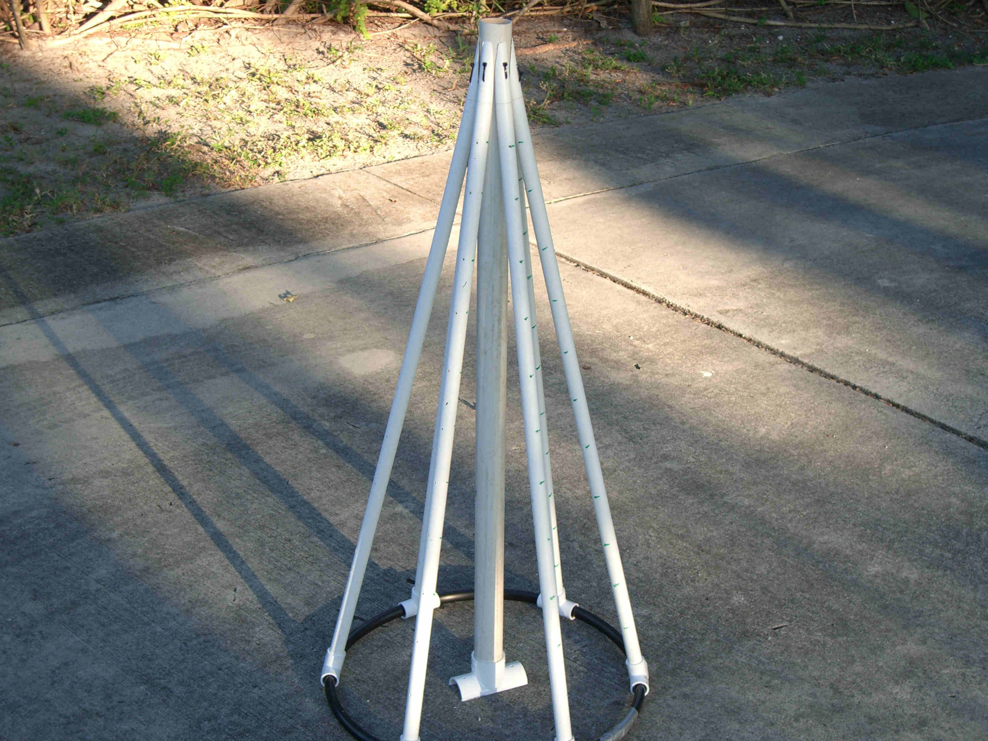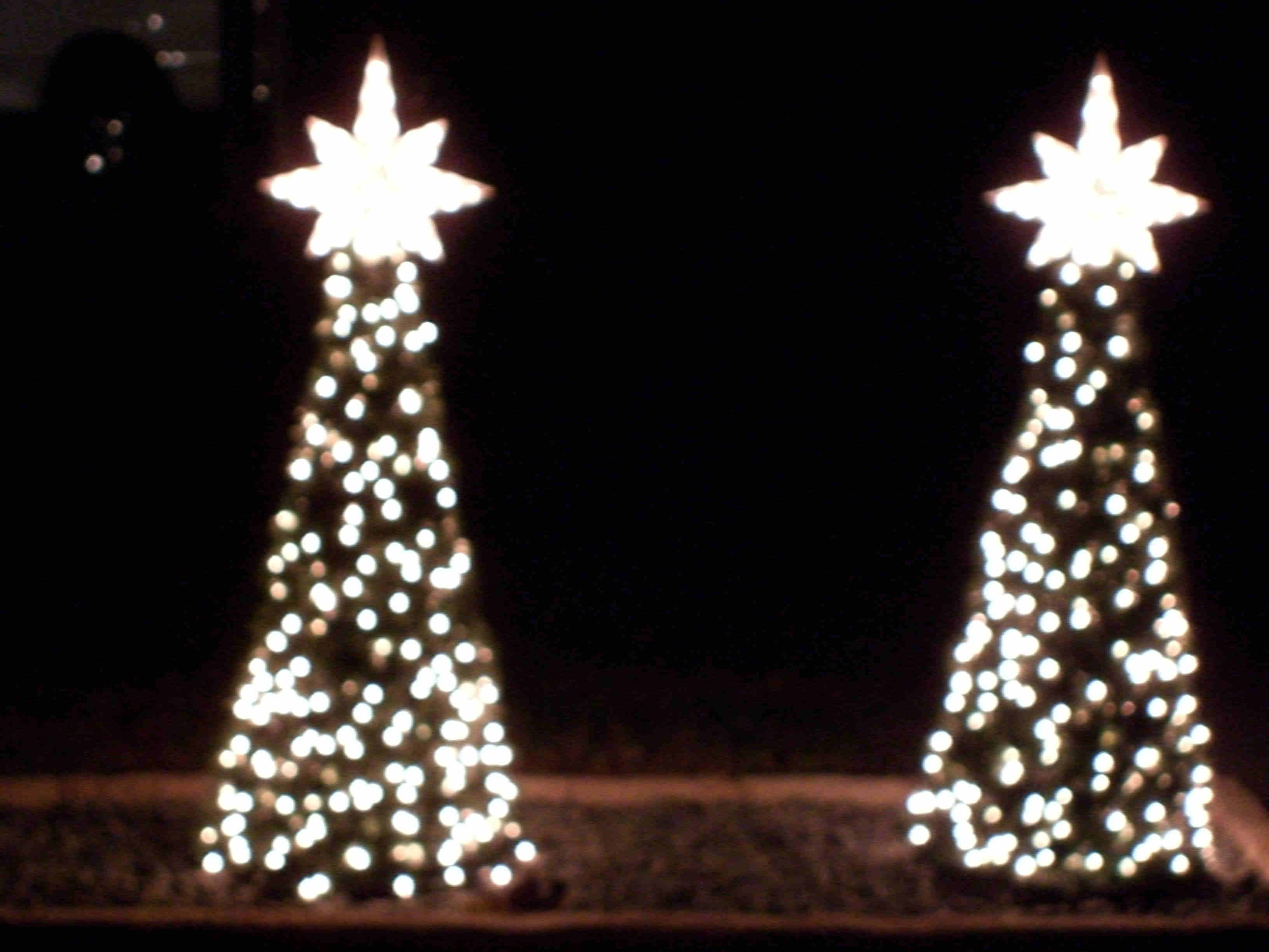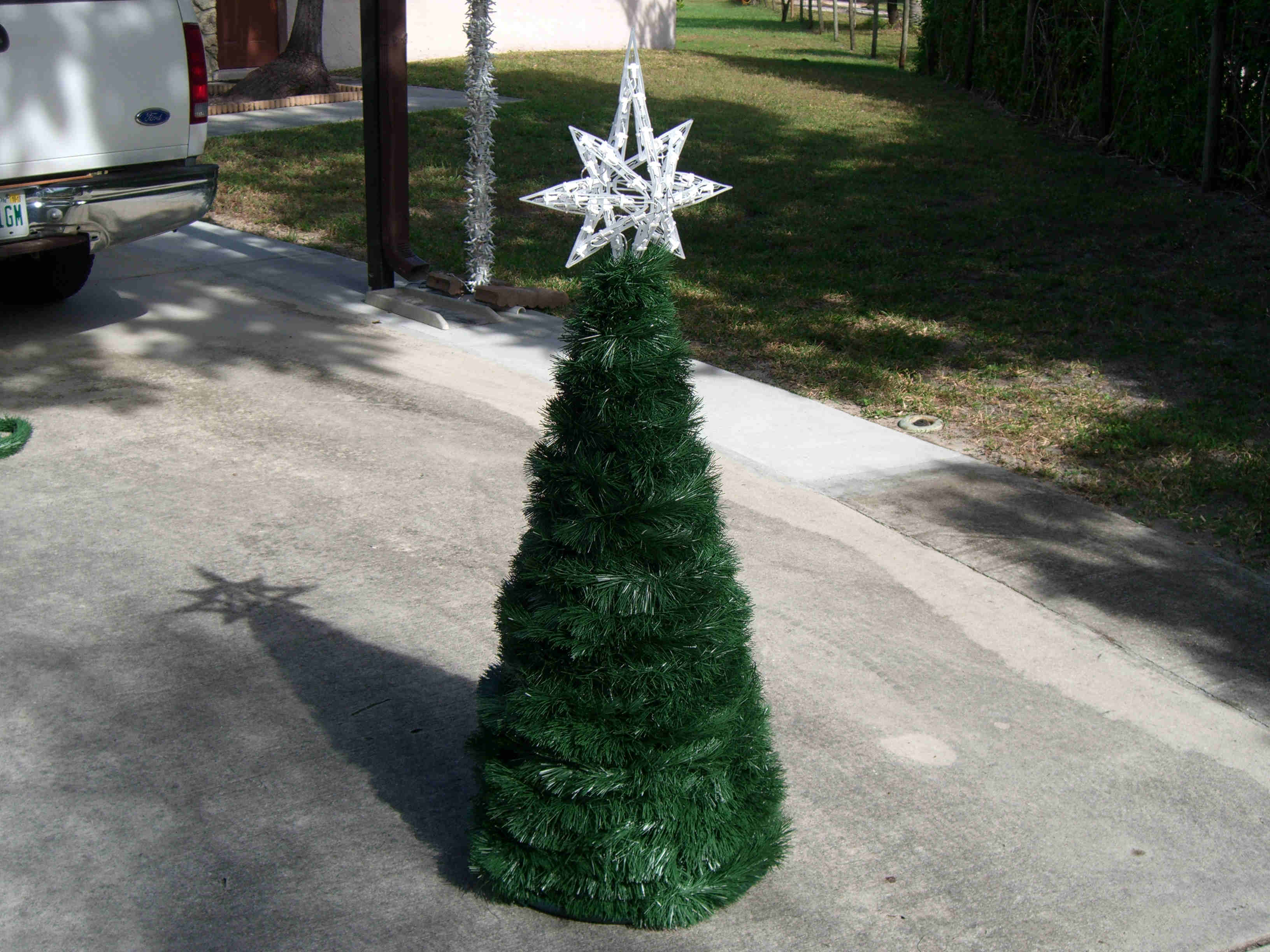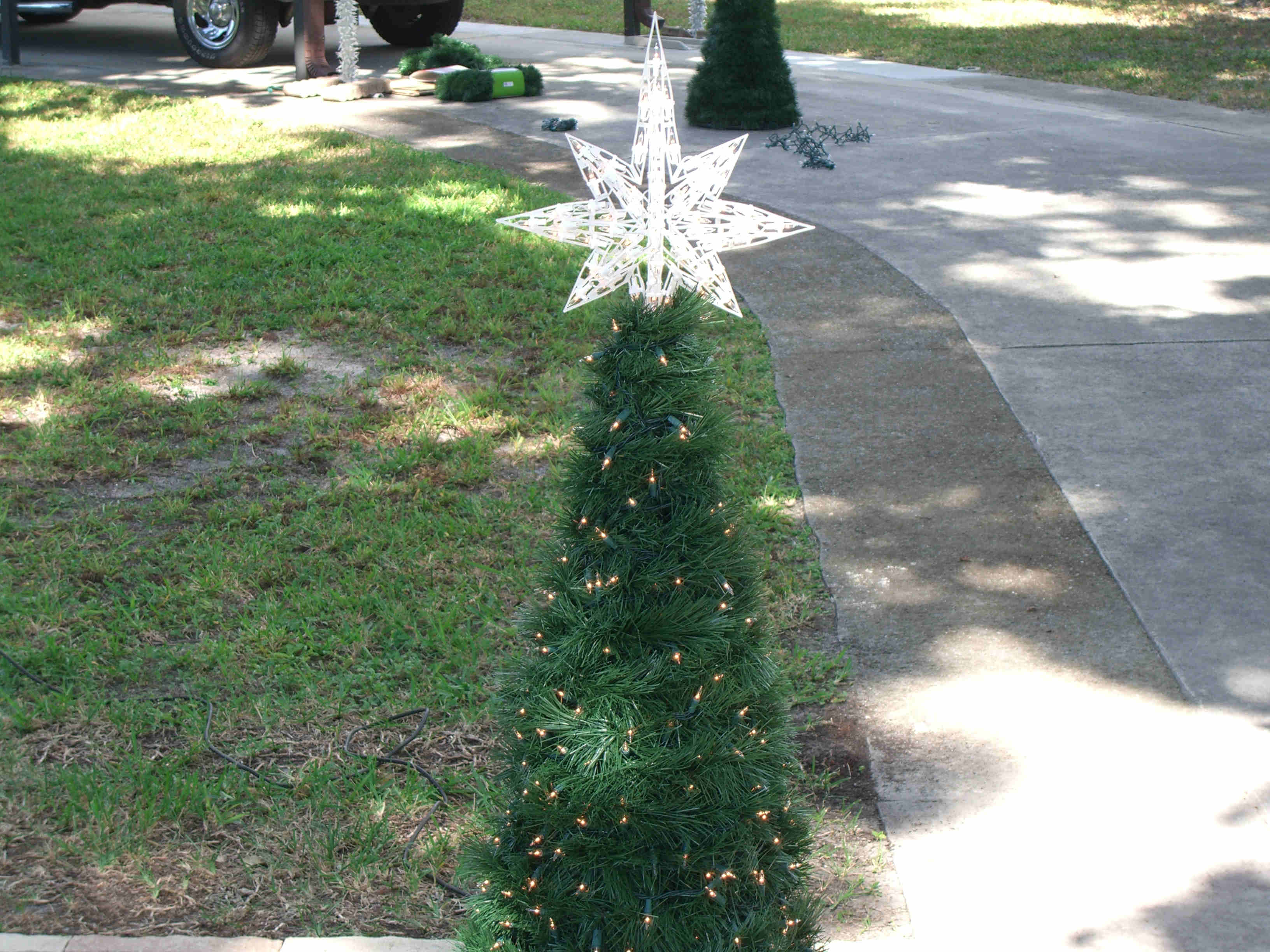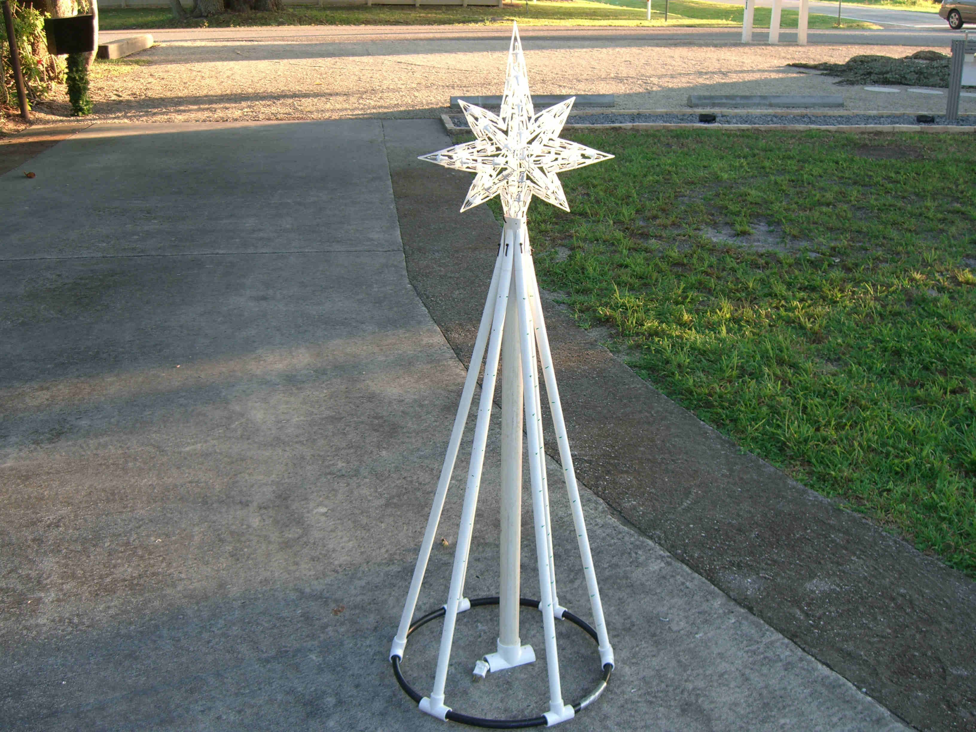 I made five mini trees, four of which had one type of star and the last one had a different star and was placed in the middle. All five were made the same way and size. Each tree was made from 2 - 10' pieces of schedule 40 1/2" PVC, 1 - 38" piece of 1 1/2" thin wall PVC, 6 - 1/2" "T"s, 1 - 1 1/2" "T", about 6' of 1/2" black sprinkler pipe, many zip ties, about 65' of garland, 400 mini lights, and a star. The 1/2" PVC was cut into 6 - 38" pieces. The top 5" was cut at an angle so that it would fit against the 1 1/2" middle pipe. The 1/2" "T"s were placed over the 1/2" black sprinkler pipe and the pipe was then taped with duck tape so that it made a complete circle. A "T" was then pulled over the tape to hold in place. Holes were drilled in the 1/2" pipe to be able to attach the garland and lights to tree with zip ties. All the 1/2" pipes were placed in the "T"s brought up and zip tied to the 1 1/2" middle pipe about 2" from the top. This was done by drilling holes through both the 1/2" and 1 1/2" pipes at the same time then zip tie placed through all holes. This makes the tree which is then spay painted Hunter Green and left to dry over night. The next day the star is added using zip ties to hold in place through drilled holes at the top of the 1 1/2" pipe. The tree is wrapped with garland using zip ties to hold in place. Then the lights are added and the tree is moved in place. Once in place it is pinned to the ground using landscape pins and the garland is then fluffed up around the lights. I tested the lights several times to make sure all stayed lit. If you had all the materials all five trees could be made in two days.