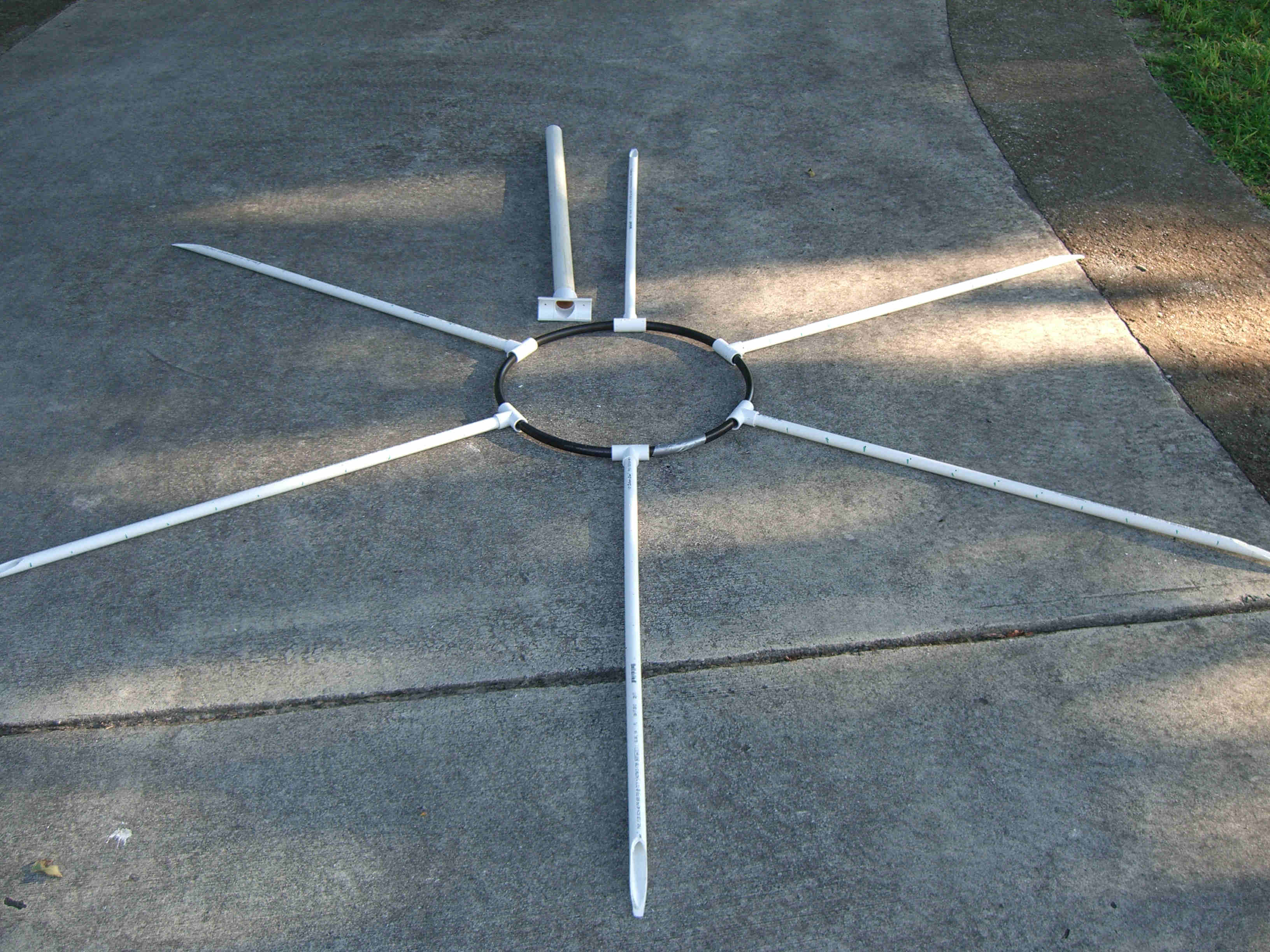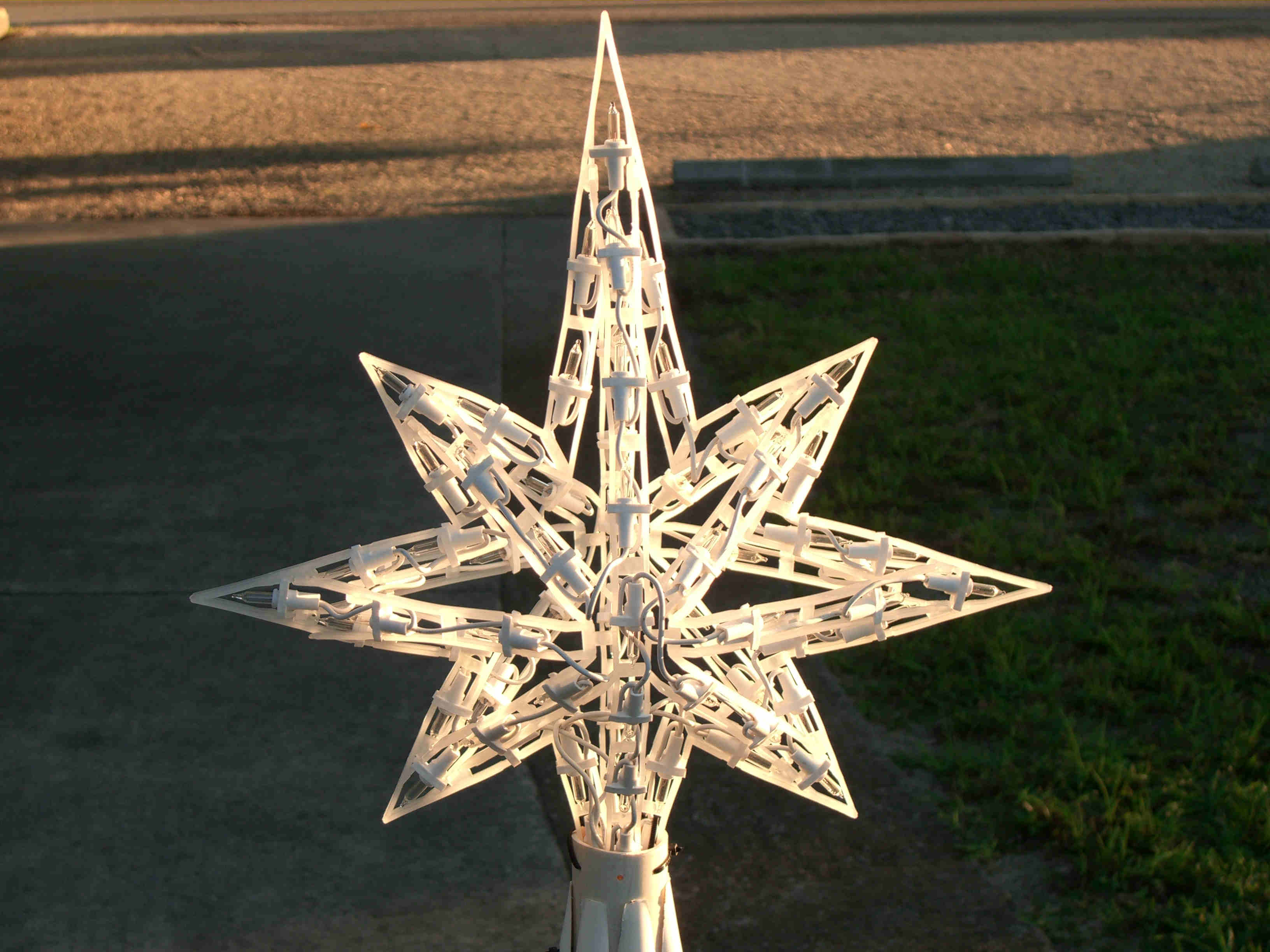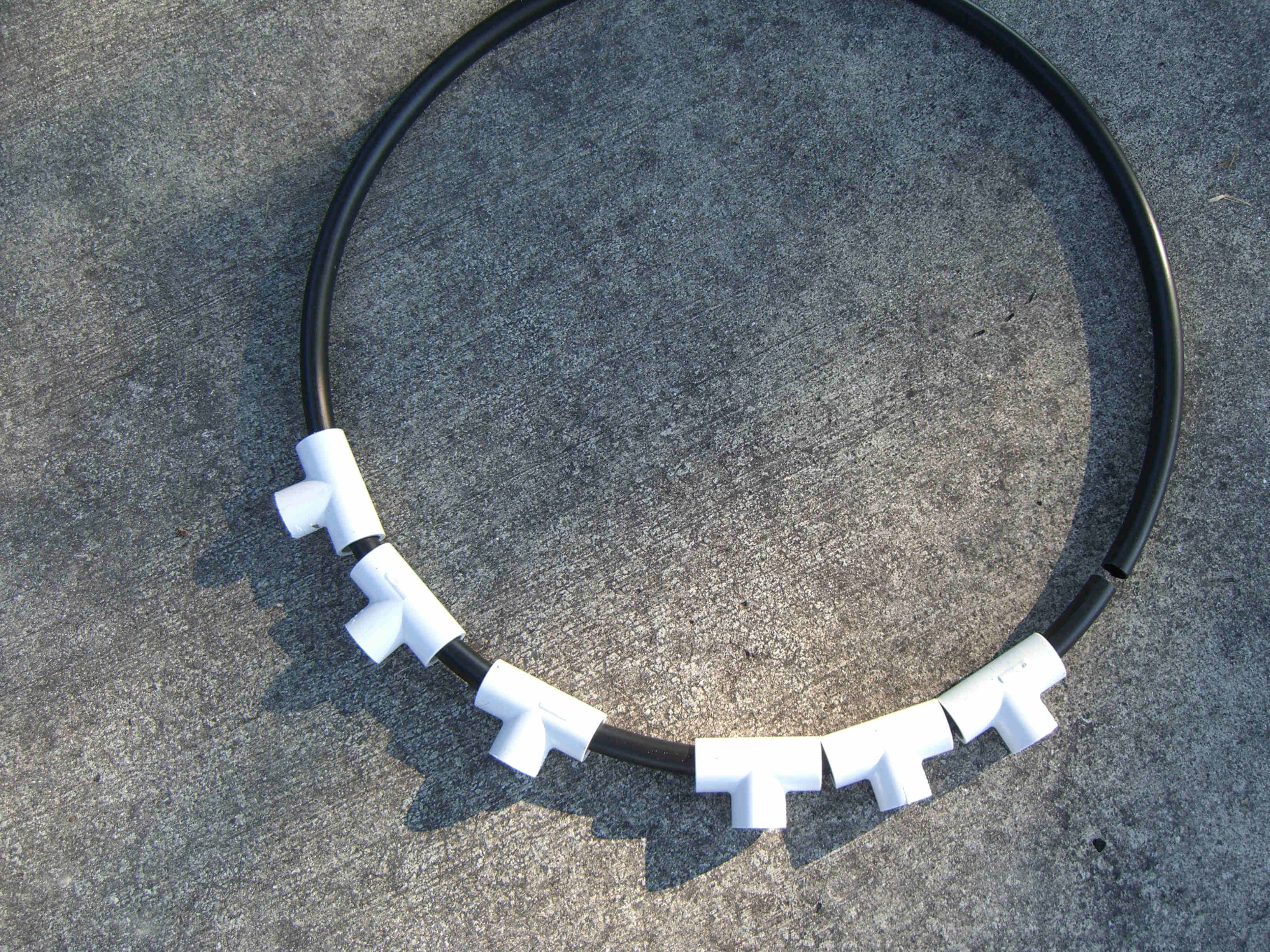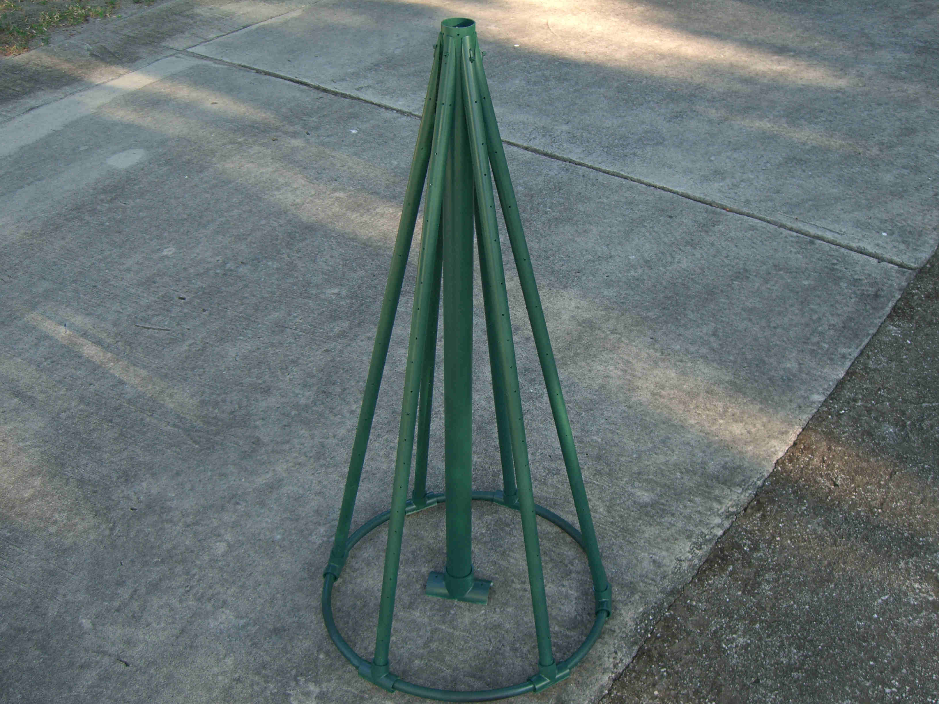 I made five mini trees, four of which had one type of star and the last one had a different star and was placed in the middle. All five were made the same way and size. Each tree was made from 2 - 10' pieces of schedule 40 1/2" PVC, 1 - 38" piece of 1 1/2" thin wall PVC, 6 - 1/2" "T"s, 1 - 1 1/2" "T", about 6' of 1/2" black sprinkler pipe, many zip ties, about 65' of garland, 400 mini lights, and a star. The 1/2" PVC was cut into 6 - 38" pieces. The top 5" was cut at an angle so that it would fit against the 1 1/2" middle pipe. The 1/2" "T"s were placed over the 1/2" black sprinkler pipe and the pipe was then taped with duck tape so that it made a complete circle. A "T" was then pulled over the tape to hold in place. Holes were drilled in the 1/2" pipe to be able to attach the garland and lights to tree with zip ties. All the 1/2" pipes were placed in the "T"s brought up and zip tied to the 1 1/2" middle pipe about 2" from the top. This was done by drilling holes through both the 1/2" and 1 1/2" pipes at the same time then zip tie placed through all holes. This makes the tree which is then spay painted Hunter Green and left to dry over night. The next day the star is added using zip ties to hold in place through drilled holes at the top of the 1 1/2" pipe. The tree is wrapped with garland using zip ties to hold in place. Then the lights are added and the tree is moved in place. Once in place it is pinned to the ground using landscape pins and the garland is then fluffed up around the lights. I tested the lights several times to make sure all stayed lit. If you had all the materials all five trees could be made in two days.