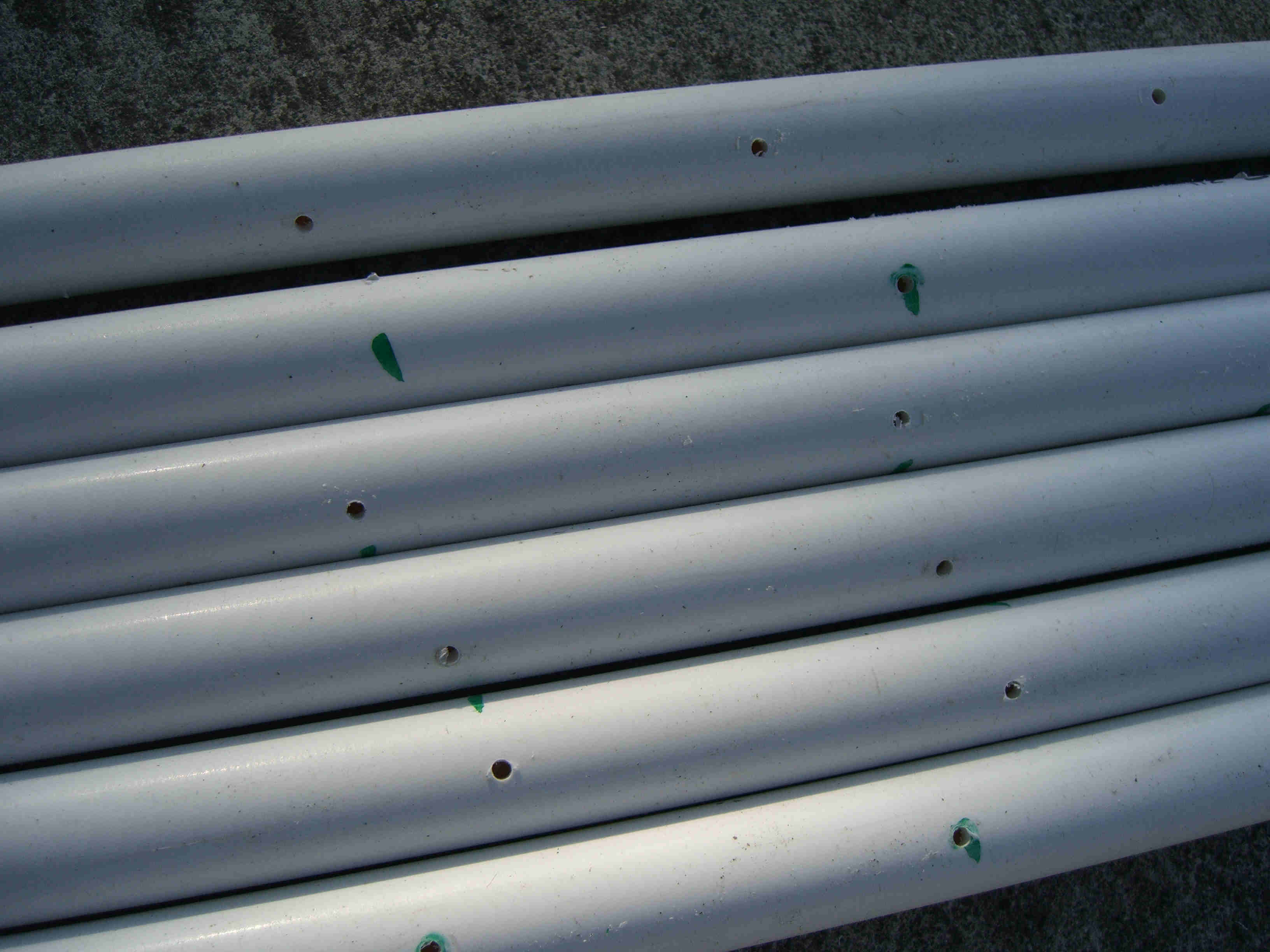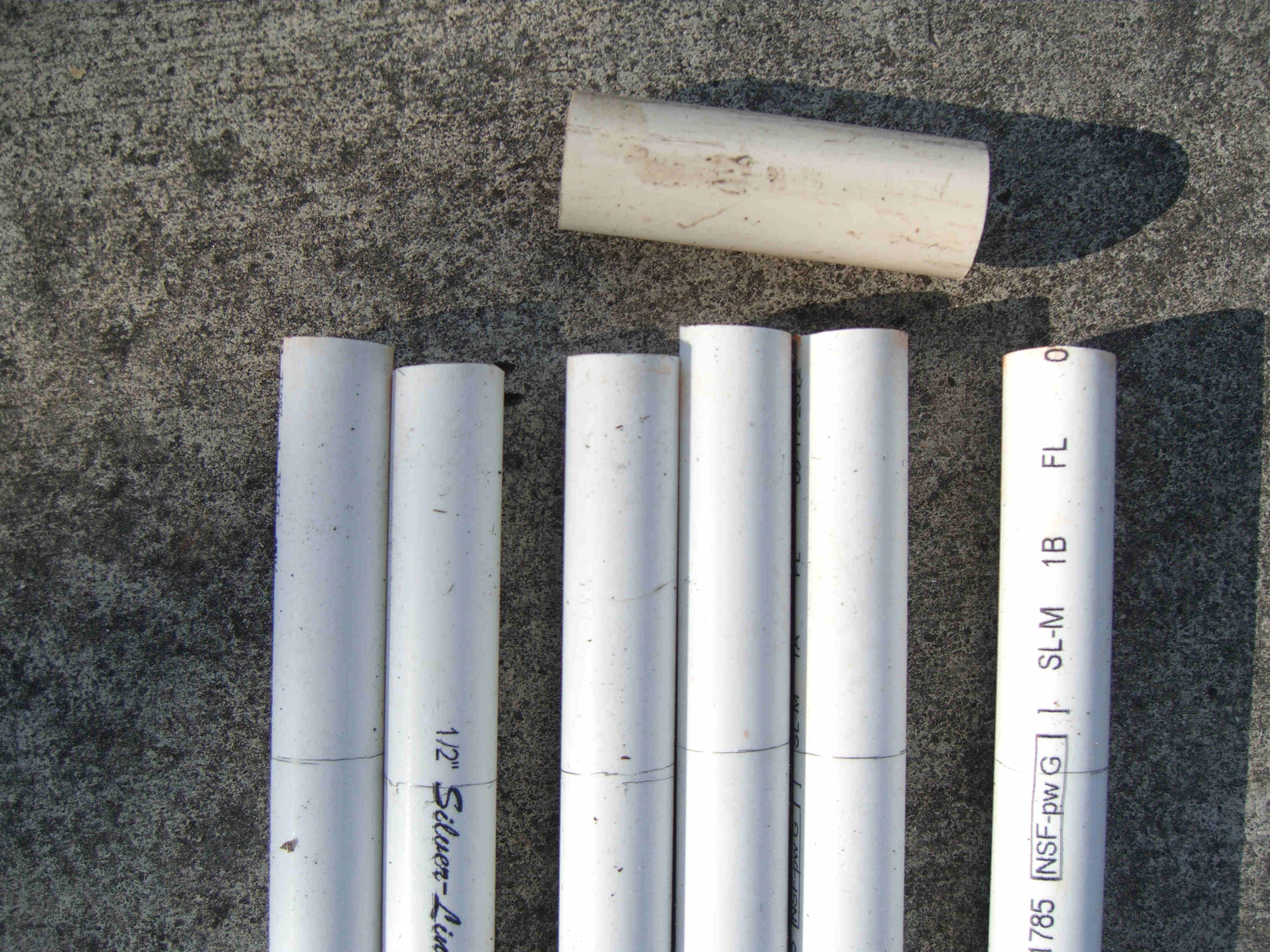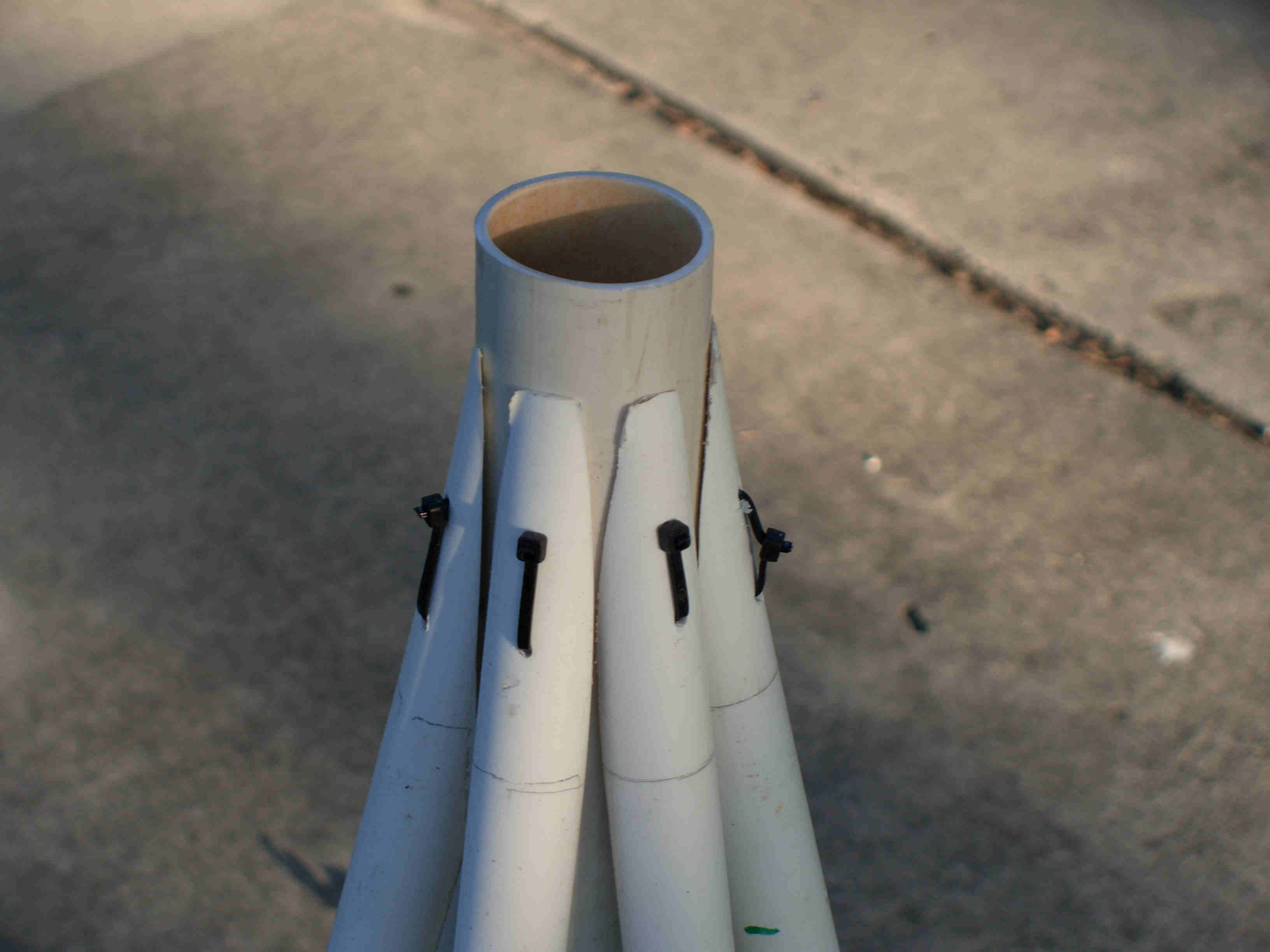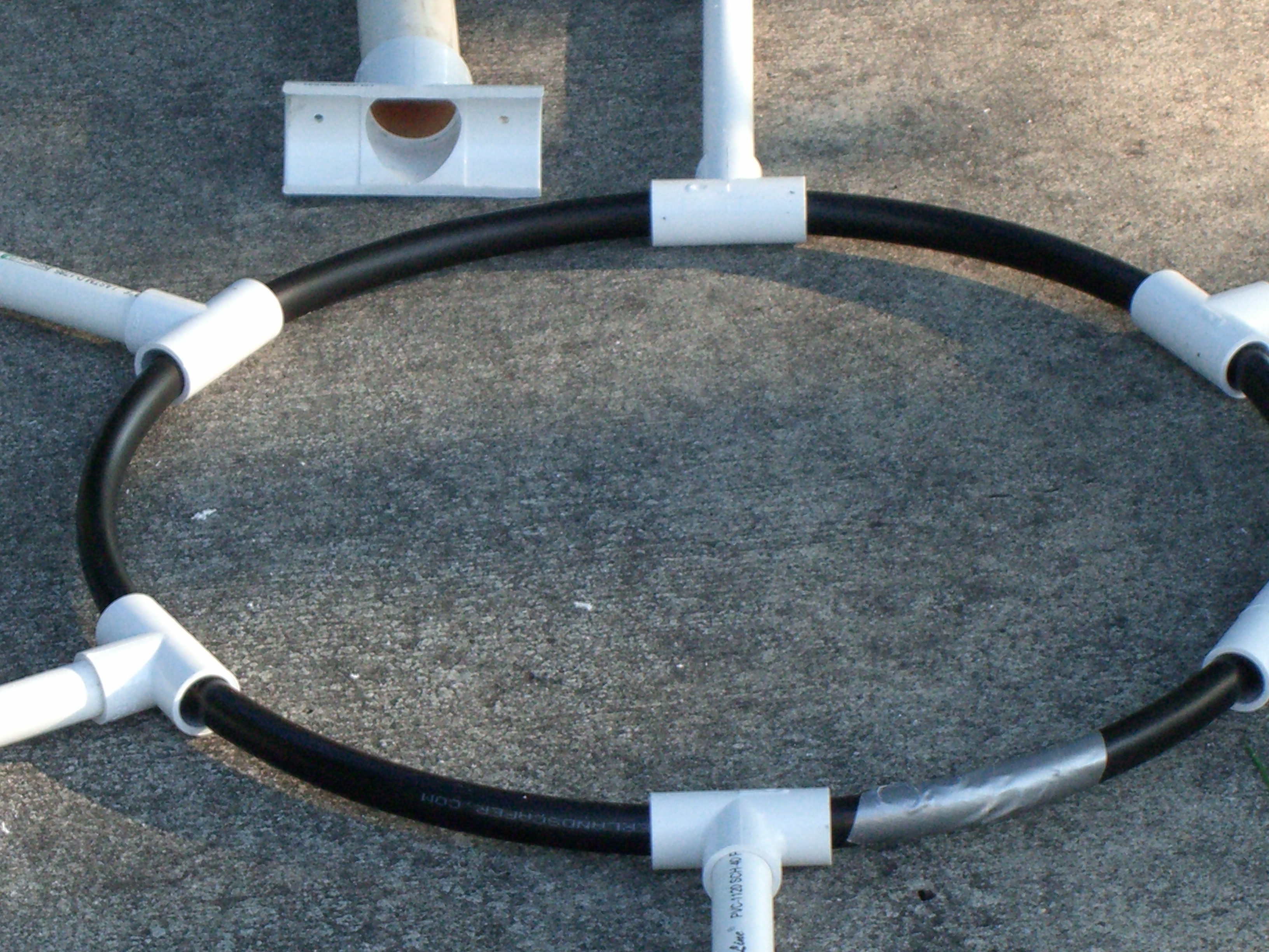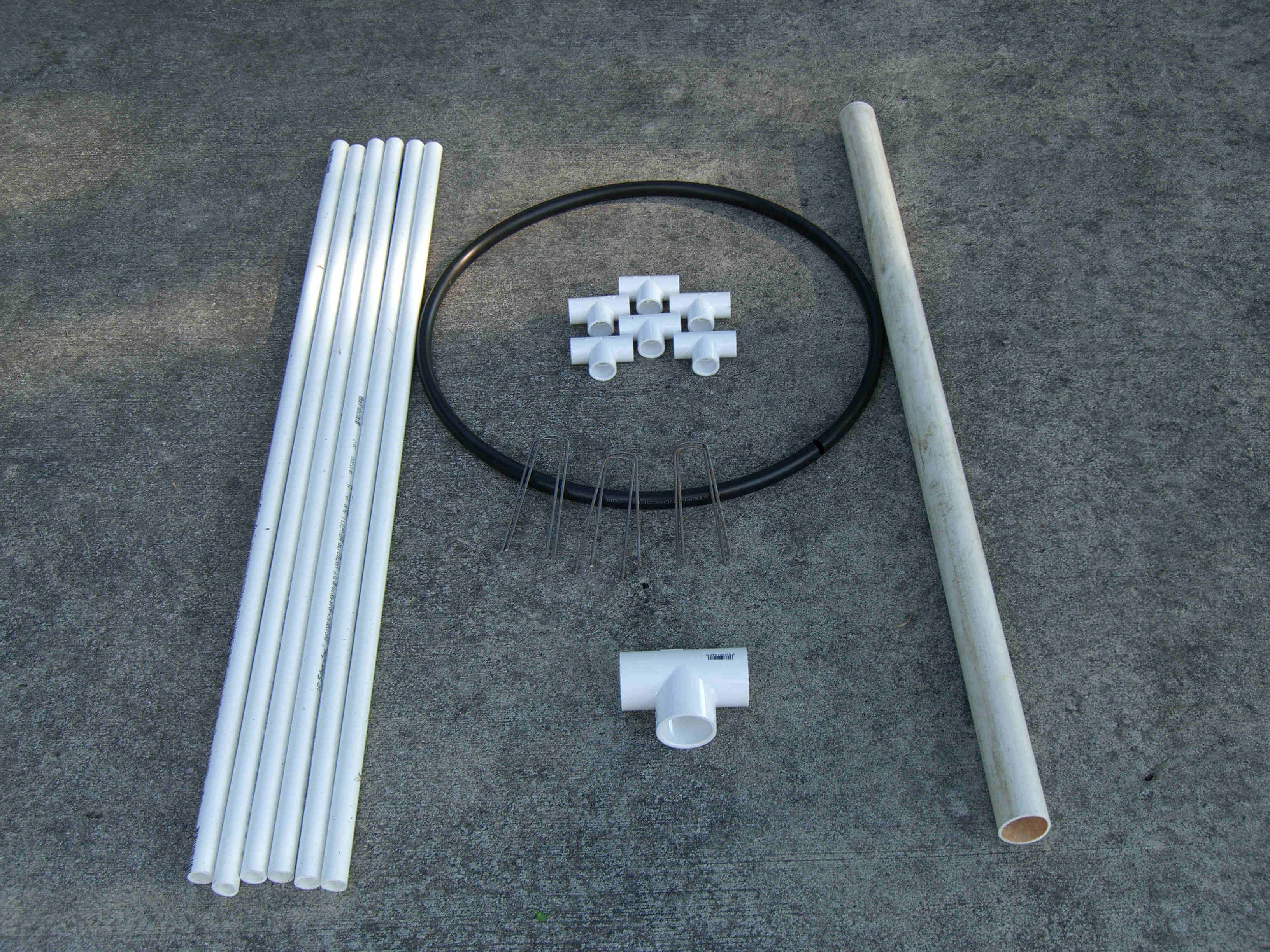 I made five mini trees, four of which had one type of star and the last one had a different star and was placed in the middle. All five were made the same way and size. Each tree was made from 2 - 10' pieces of schedule 40 1/2" PVC, 1 - 38" piece of 1 1/2" thin wall PVC, 6 - 1/2" "T"s, 1 - 1 1/2" "T", about 6' of 1/2" black sprinkler pipe, many zip ties, about 65' of garland, 400 mini lights, and a star. The 1/2" PVC was cut into 6 - 38" pieces. The top 5" was cut at an angle so that it would fit against the 1 1/2" middle pipe. The 1/2" "T"s were placed over the 1/2" black sprinkler pipe and the pipe was then taped with duck tape so that it made a complete circle. A "T" was then pulled over the tape to hold in place. Holes were drilled in the 1/2" pipe to be able to attach the garland and lights to tree with zip ties. All the 1/2" pipes were placed in the "T"s brought up and zip tied to the 1 1/2" middle pipe about 2" from the top. This was done by drilling holes through both the 1/2" and 1 1/2" pipes at the same time then zip tie placed through all holes. This makes the tree which is then spay painted Hunter Green and left to dry over night. The next day the star is added using zip ties to hold in place through drilled holes at the top of the 1 1/2" pipe. The tree is wrapped with garland using zip ties to hold in place. Then the lights are added and the tree is moved in place. Once in place it is pinned to the ground using landscape pins and the garland is then fluffed up around the lights. I tested the lights several times to make sure all stayed lit. If you had all the materials all five trees could be made in two days.
