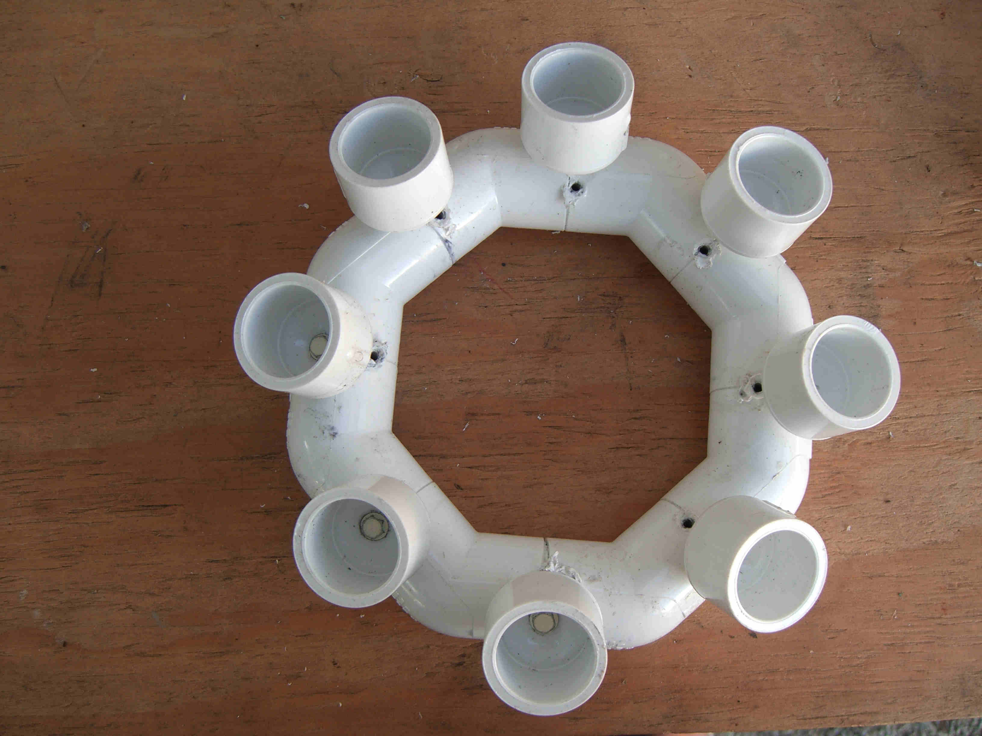 I Used 16 - 3/4" 45s, 8 - 3/4" Tees, 8 - 3/4" caps, 8 - 1.5" schedule 40 PVC pipe, 16 - 6" schedule 40 PVC pipe, 8 - 5' schedule 40 PVC pipe, 1 can medium PVC glue, 7mm heat shrink tube, 32 - 2.5" fine thread dry wall screws, box - 1" fine thread dry wall screws, 3 cans of flat black spray paint, 8 - 60 count blue LED light strings, and 8 - 60 count green LED light strings. The top was made with 8 3/4" 45s glued together using 8 1.5" pieces of pipe. Screw caps into 45s where they touch each other using screws. Glue 45s to 6" pieces of pipe. Do not glue to tees. Glue uprights to tees put uprights into caps. Put bottom pieces into place tap everything together and check. If it all looks ok, tap the top off and put glue inside caps. Quickly put the ring with all 8 caps on all at once and using a hammer tap all back into place. This is very tricky and has to be done quickly but it can be done. Tap apart one end of one of the T's. Glue and put back. Go to the next end and do the same. Continue until all Ts have been glued and put back into place. Screw long dry wall screws into the top. Cut and heat shrink the heat shrink tube around screws to protect wire from rough edges of the screws. Lay out one strand of lights in the desired spiral shape. Using 1" (2.5" on the very bottom ring.) dry wall screws mark where the wire crosses pipe. Find distance from top and screw screws in each of the eight uprights for each wire. Paint using flat black spray paint. String wires around. Wire to controller and light. My measurements for the 5' tree were 1.75", 3.5", 5.25", 7", 9.5", 12", 17.75", 23.5", 29.25", 35", 40.5", 46", 49.5", 53", 57", 61".