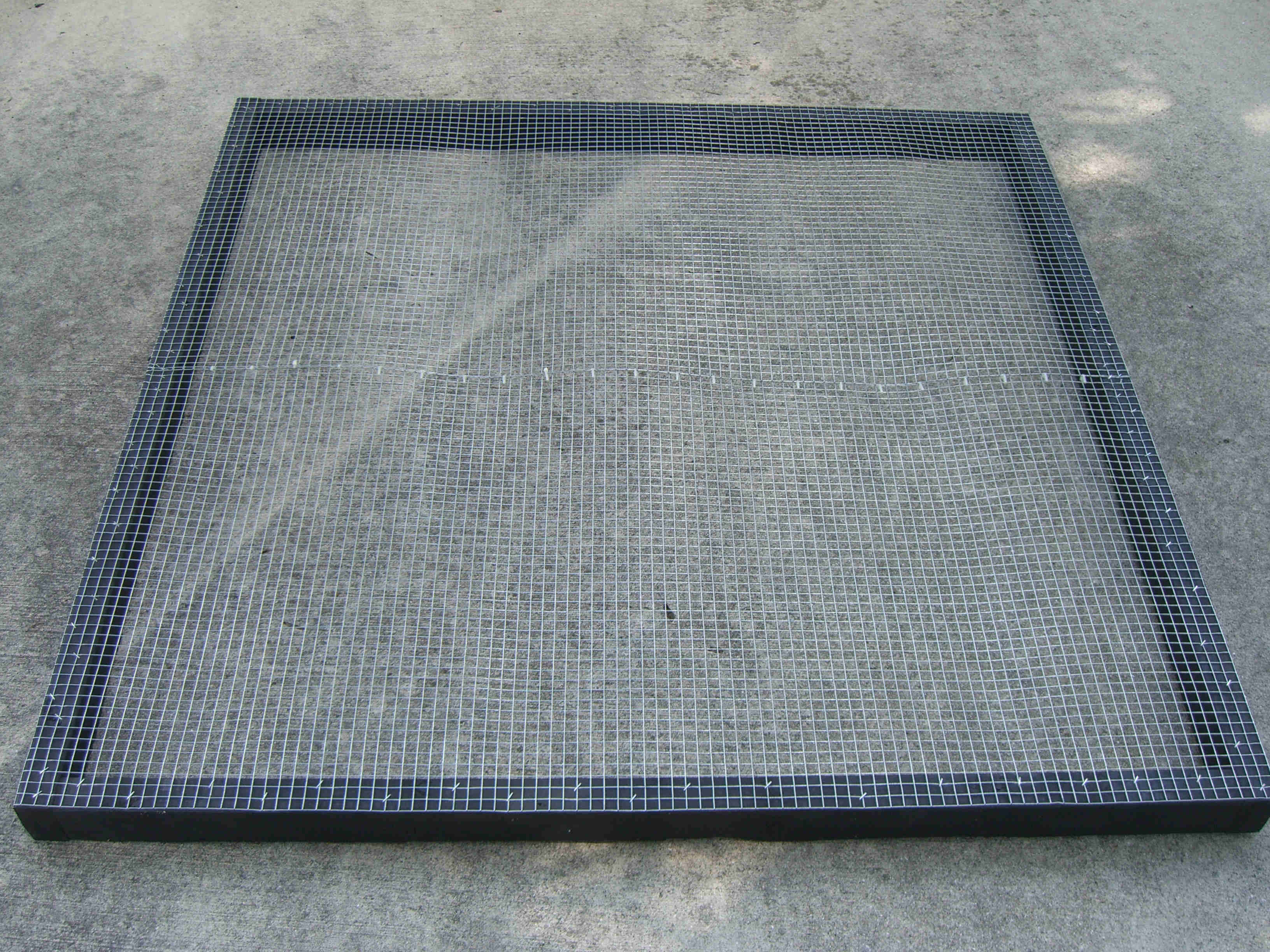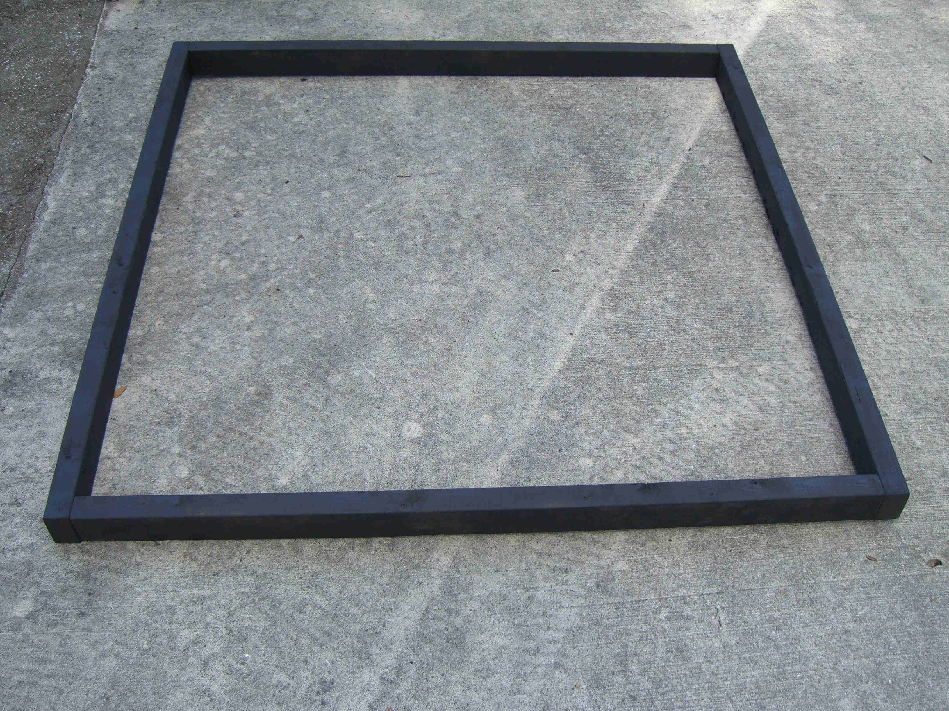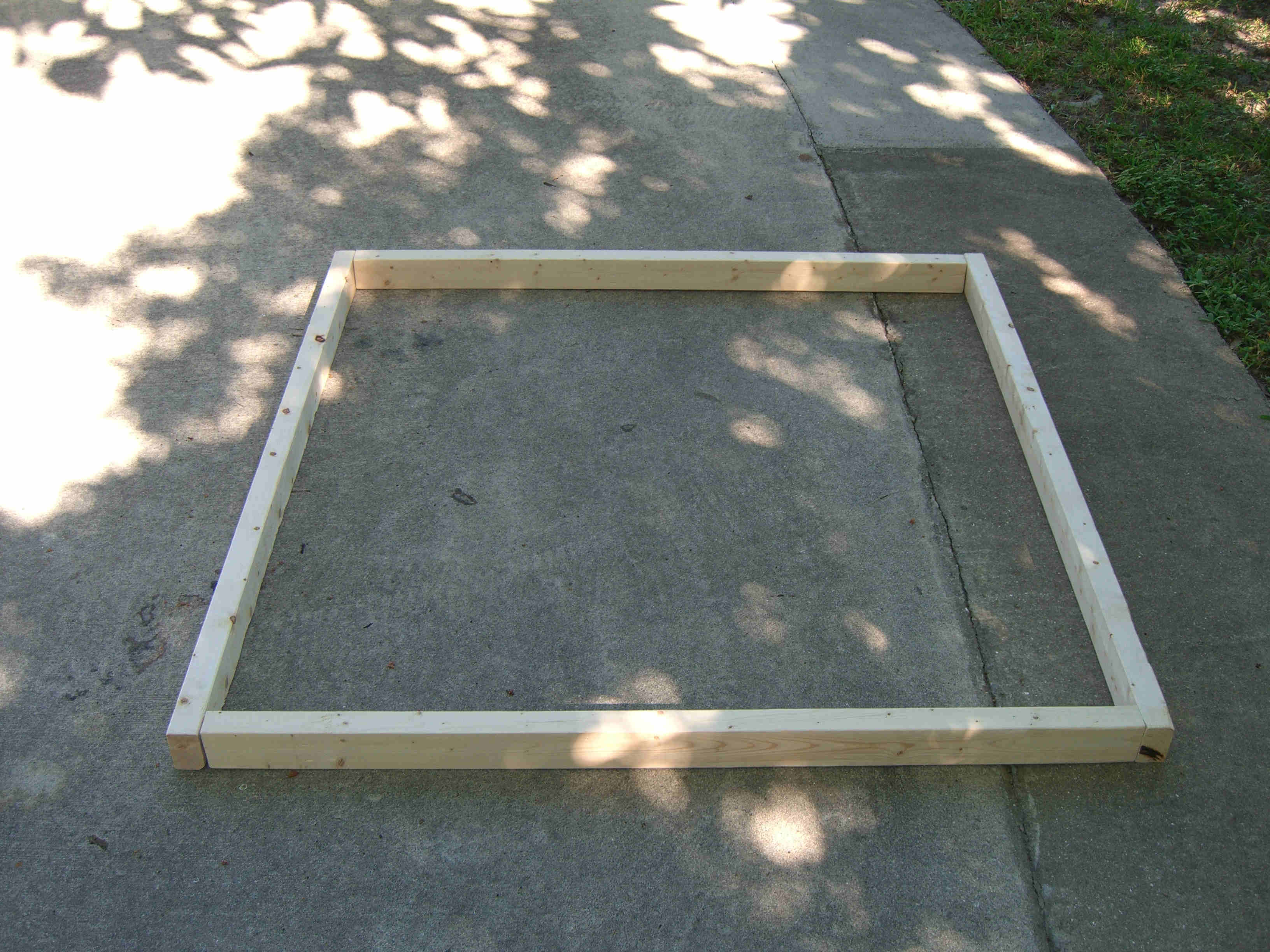 I Used 4 - 2 x 3 x 8 framing boards, 1 - roll 1/2" x 1/2" - 2' x 25' (19 gauge) Hardware Cloth, 2.5" star screws, 9/16" staples, small zip ties, and 2 cans flat black paint. Cut 2 x 3s into 2 - 4' pieces, 2 - 3'9" pieces, 2 - 51" pieces, and 4 - 22.5" pieces. Sand edges on the 4' and 3'9" pieces. Take 4 - 22.5" pieces and cut one end of each at an angle so they can be driven in the ground. Using 2.5" screws, attach pieces to form a 4' x 4' section. Paint all sides flat black. Roll out wire and attach using staples to top of frame and over 2 sides. Do same at bottom of frame putting open edges in middle. Do not overlap wire but butt it up against each other. Use small zip ties to connect wire in middle for strength. Paint both sides of wire with flat black paint. Once lights have been attached, drive stakes into ground and attach frame using screws.