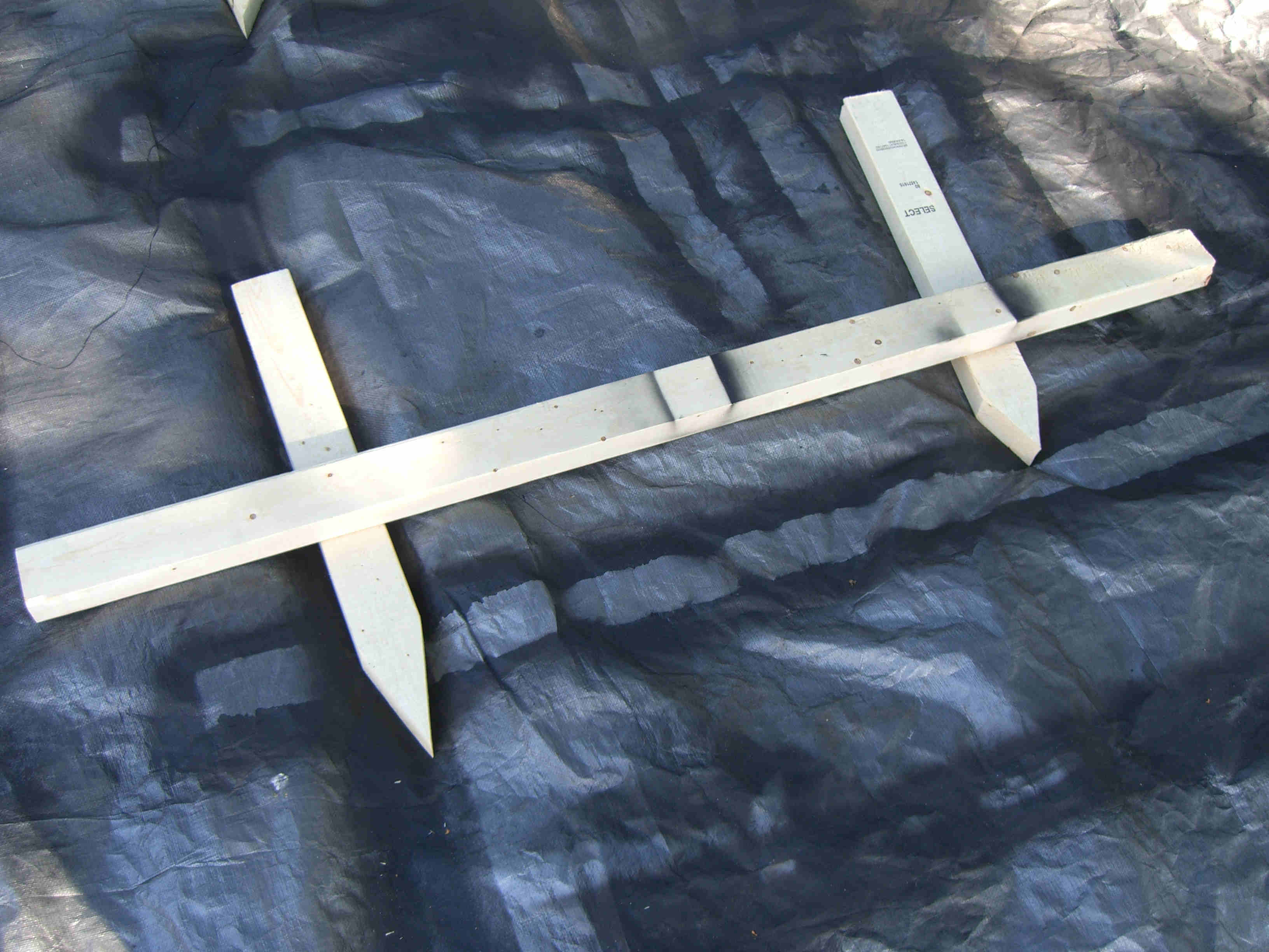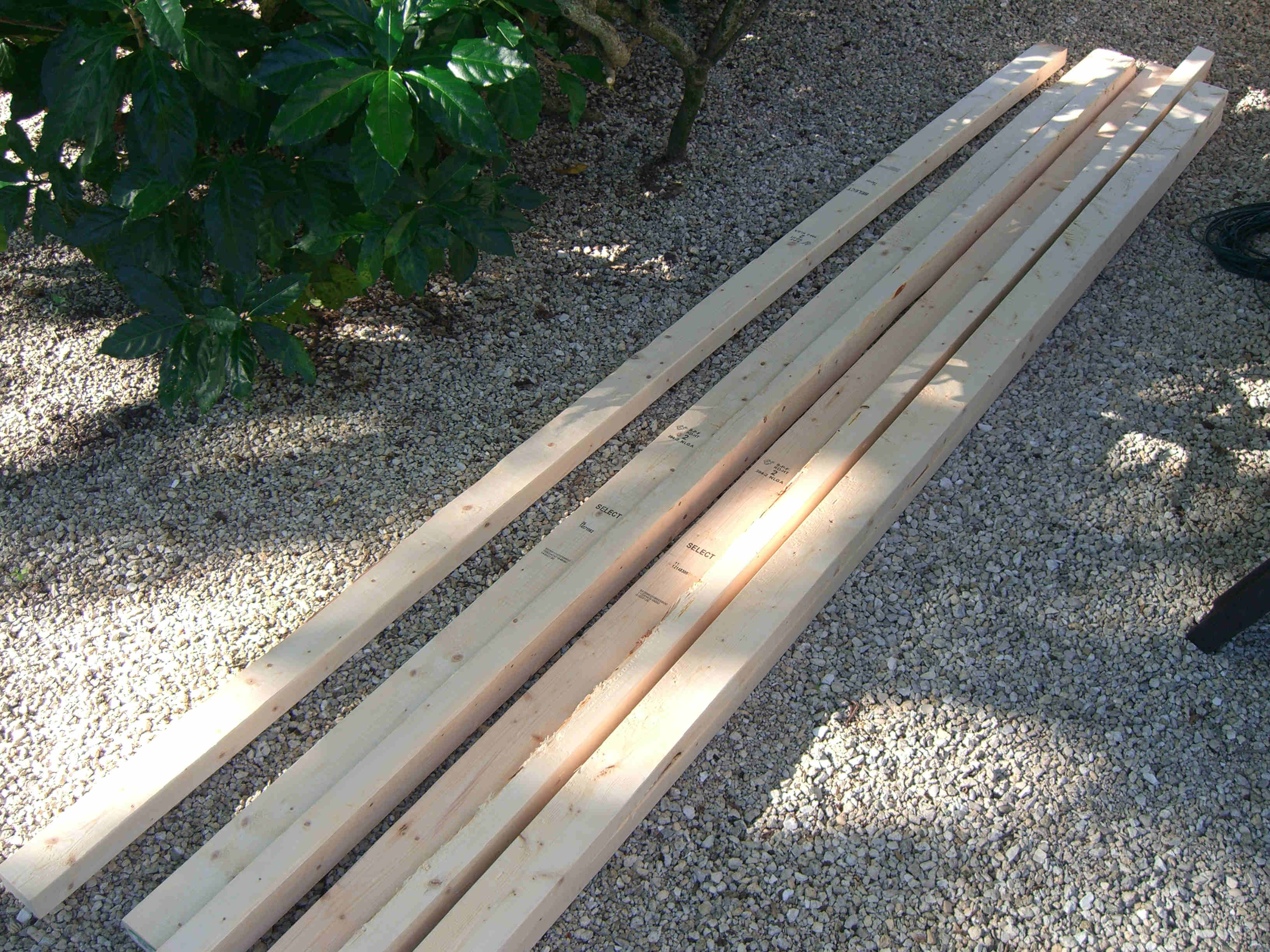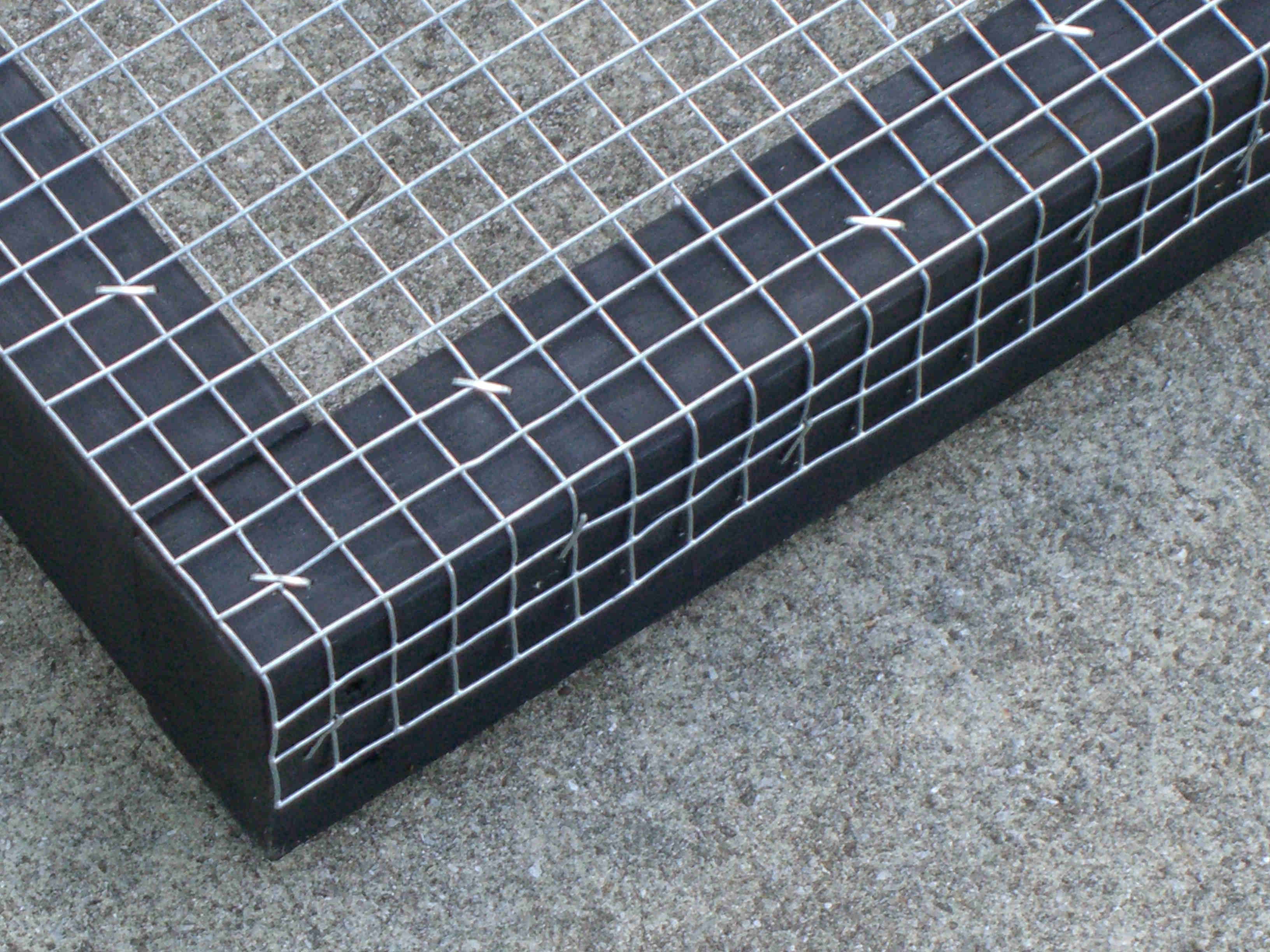 I Used 4 - 2 x 3 x 8 framing boards, 1 - roll 1/2" x 1/2" - 2' x 25' (19 gauge) Hardware Cloth, 2.5" star screws, 9/16" staples, small zip ties, and 2 cans flat black paint. Cut 2 x 3s into 2 - 4' pieces, 2 - 3'9" pieces, 2 - 51" pieces, and 4 - 22.5" pieces. Sand edges on the 4' and 3'9" pieces. Take 4 - 22.5" pieces and cut one end of each at an angle so they can be driven in the ground. Using 2.5" screws, attach pieces to form a 4' x 4' section. Paint all sides flat black. Roll out wire and attach using staples to top of frame and over 2 sides. Do same at bottom of frame putting open edges in middle. Do not overlap wire but butt it up against each other. Use small zip ties to connect wire in middle for strength. Paint both sides of wire with flat black paint. Once lights have been attached, drive stakes into ground and attach frame using screws.